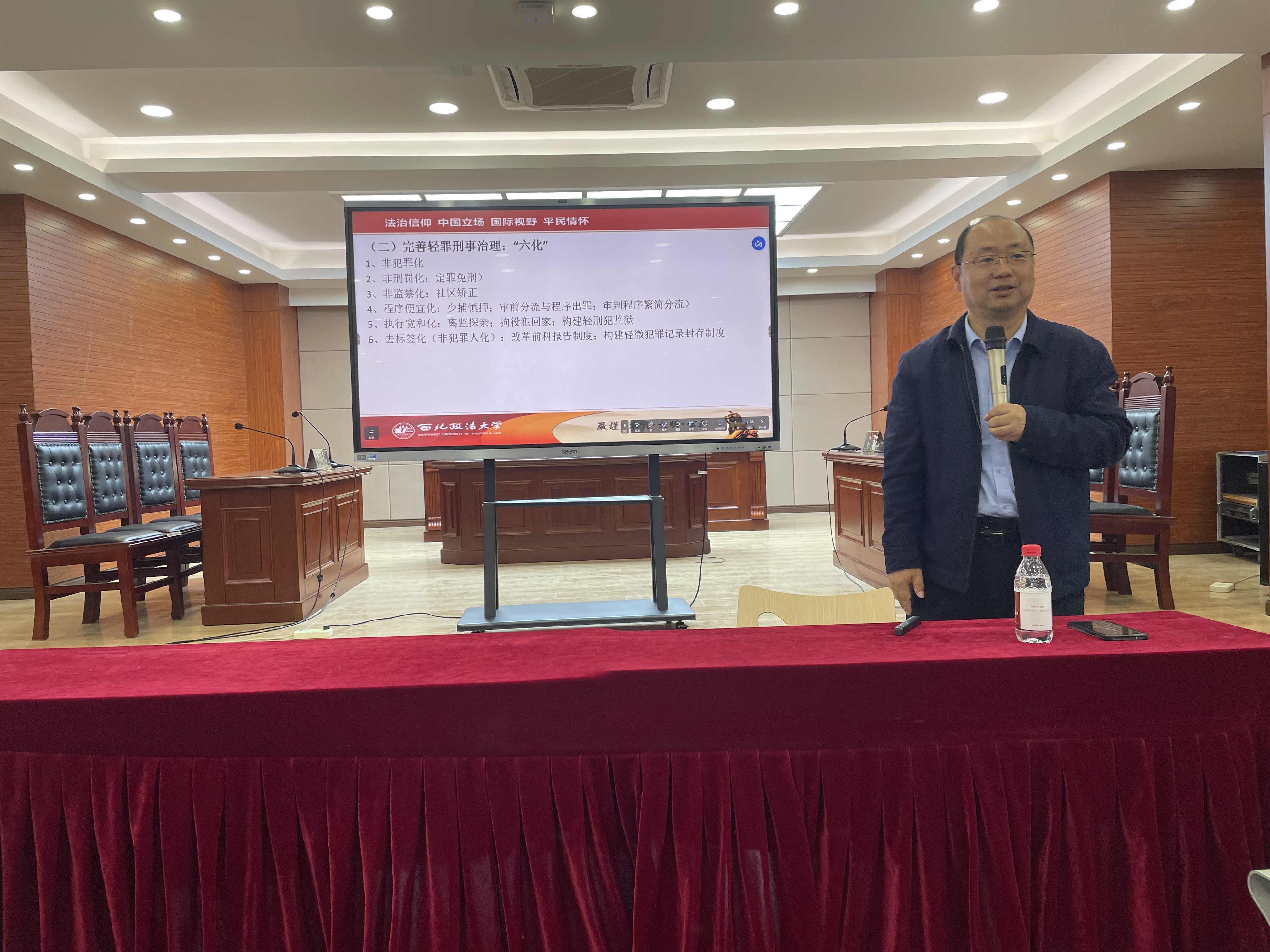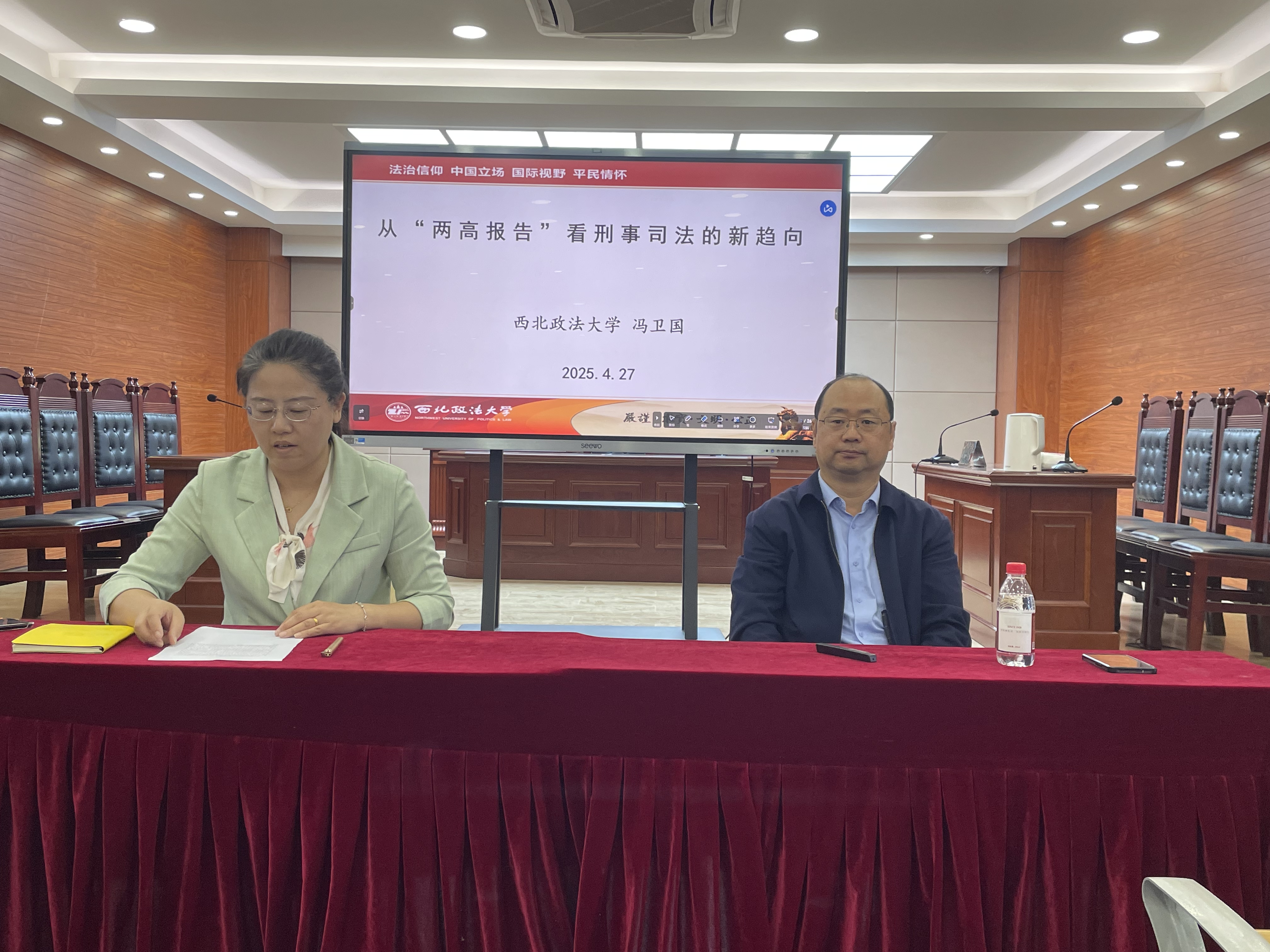 为我院师生拓宽研究视野,法学院于2025年4月27日14:00点在格物楼模拟法庭举办了《从“两高报告”看刑事司法的新趋势》的讲座。本次讲座由西北政法大学刑事法学院院长冯卫国教授主讲,法学院副院长赵洁主持,法学院各教研室全体教师和法学2301、2307班全体学生参加。