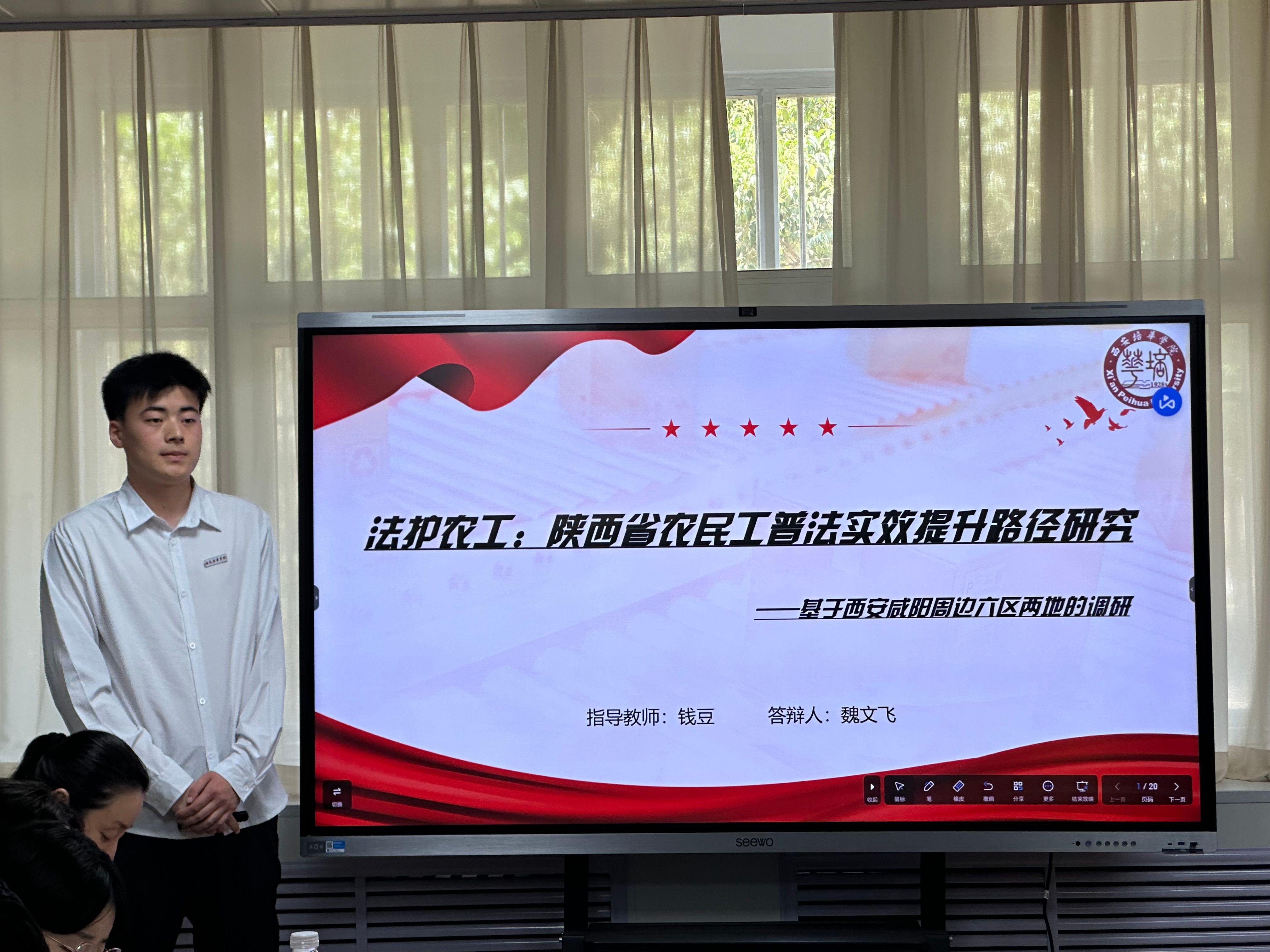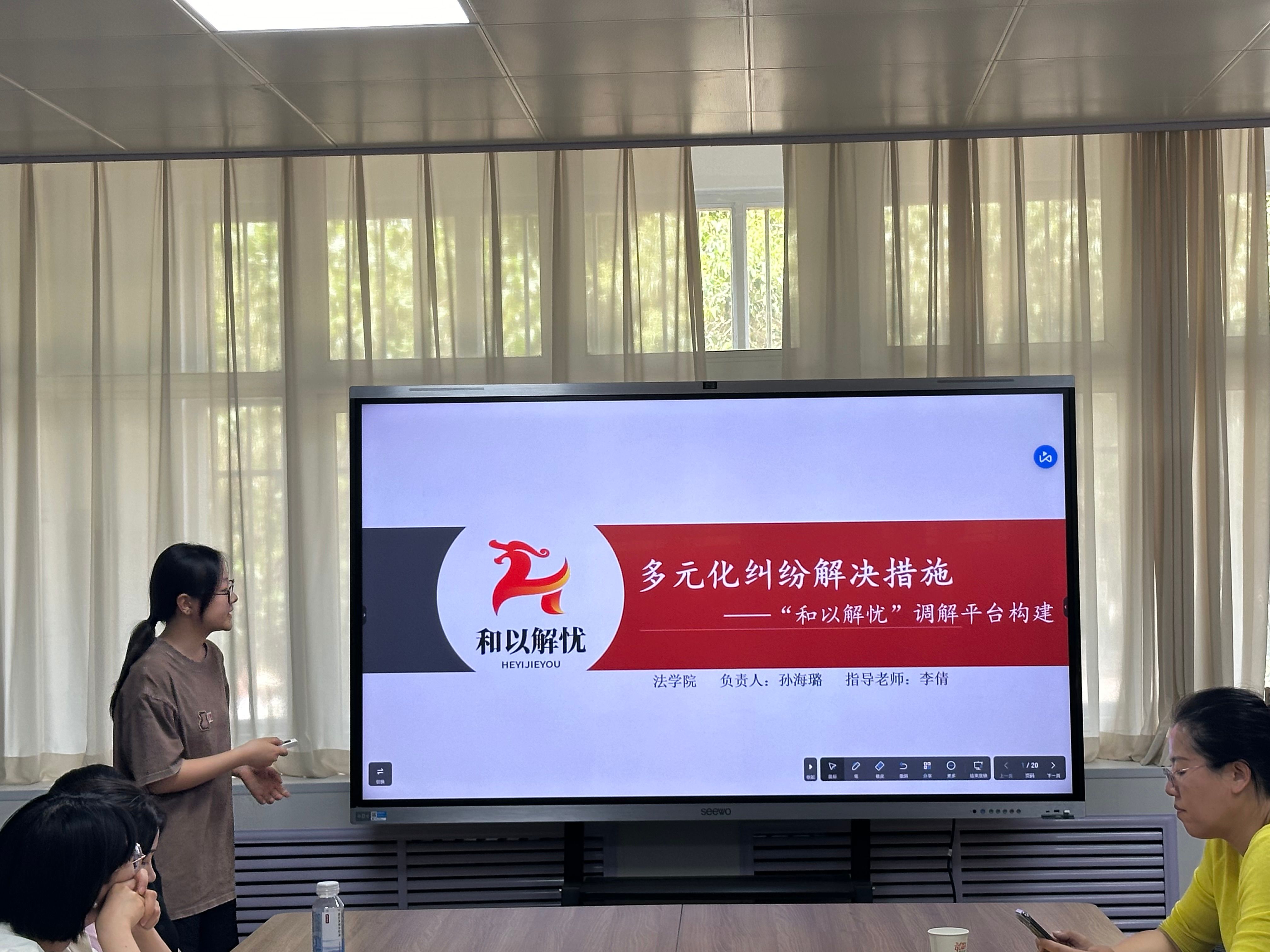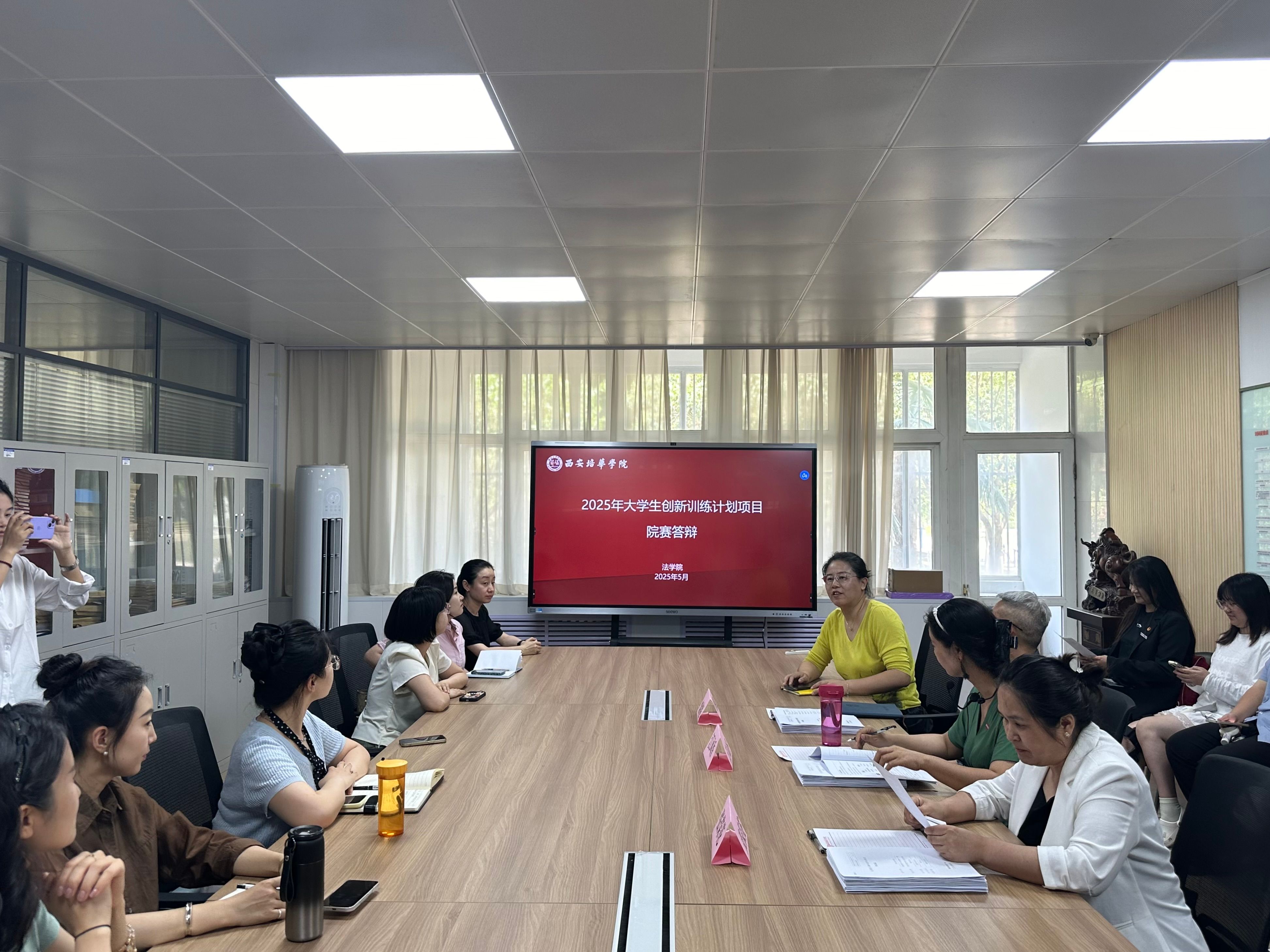 2025年5月20日星期二中午12:20,2025年大学生创新训练计划项目法学院院赛答辩在格物楼1116顺利举行。本次答辩由法学院副院长赵洁主持,各教研室教师代表出席,并邀请传媒与设计学院副院长张荣花、人文与国际教育学院副院长栾伯强以及会计与金融学院教授江凤香担任评委,共有21支队伍参加。