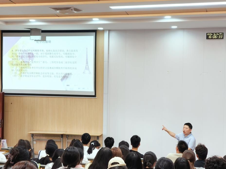 辅导员关鑫围绕《资助育人,筑梦未来》这一主题,为新生系统介绍了国家奖学金、助学金、助学贷款等多项资助项目的申请条件与流程。她特别强调学校“不让一个学生因家庭经济困难而失学”的坚定承诺,鼓励家庭经济困难的学生坦然面对困难,积极申请帮扶,将更多的精力投入到学业发展中。