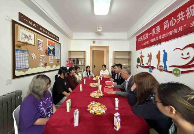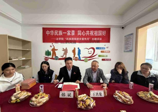 为深入学习贯彻习近平总书记关于民族团结的重要论述,在各民族中牢固树立国家意识、公民意识、中华民族共同体意识,促进各民族像石榴籽一样紧紧抱在一起,2025年9月24日15:00,法学院党总支在明德社区3号公寓党团活动室开展了“中华民族一家亲,同心共祝祖国好——法学院‘民族团结进步宣传月’”主题活动。本次活动由西安培华学院关工委指导,法学院院长王鸿貌、党总支书记韩斌、学生一支部书记李月、党务干事李紫若及少数民族新生代表共同参与。活动由院党总支书记韩斌主持。