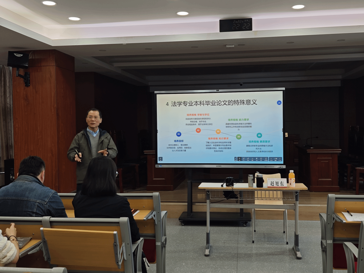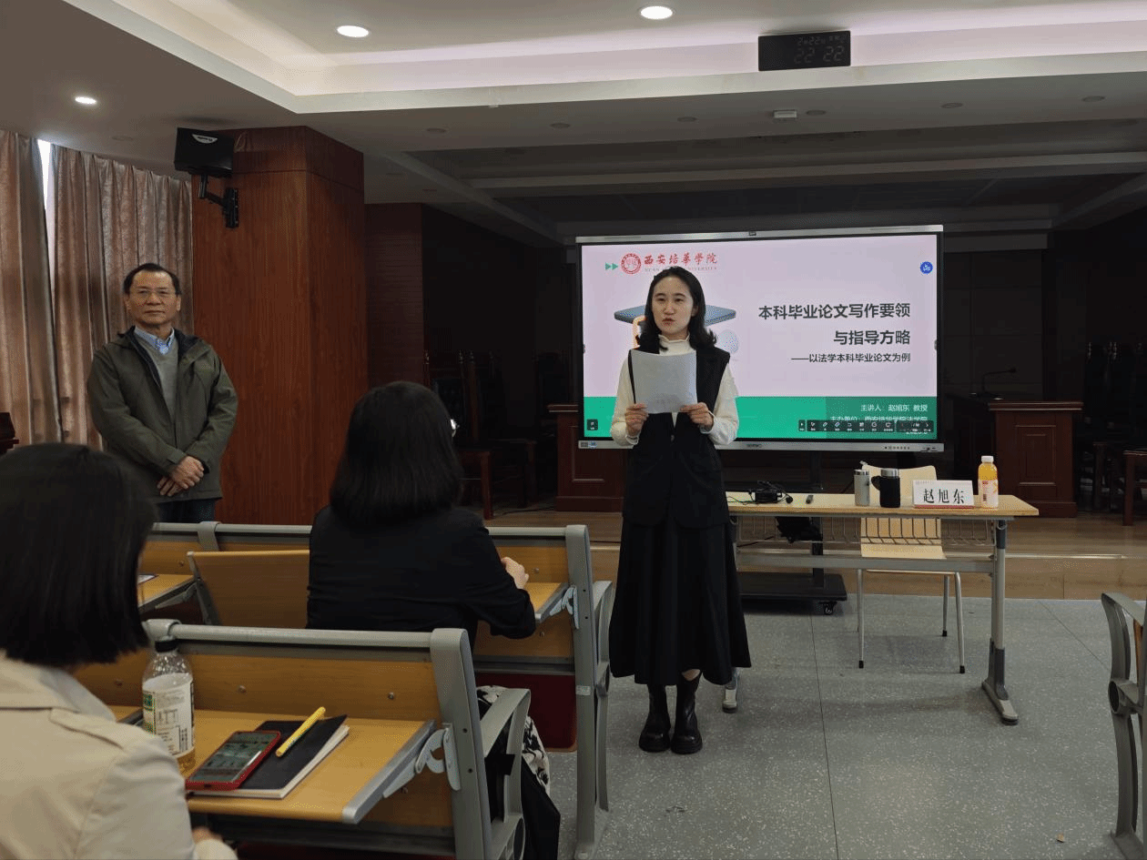 2025年10月16日14:00—16:00,西安培华学院法学院在格物楼模拟法庭举办主题为“本科毕业论文的写作要领与指导方略—— 以法学本科毕业论文为例”的专题讲座。本次讲座由法学院赵旭东教授担任主讲人,法学院院长助理高燕副教授主持。法学院全体教师、其他学院部分教师,以及法学专业部分学生参加。