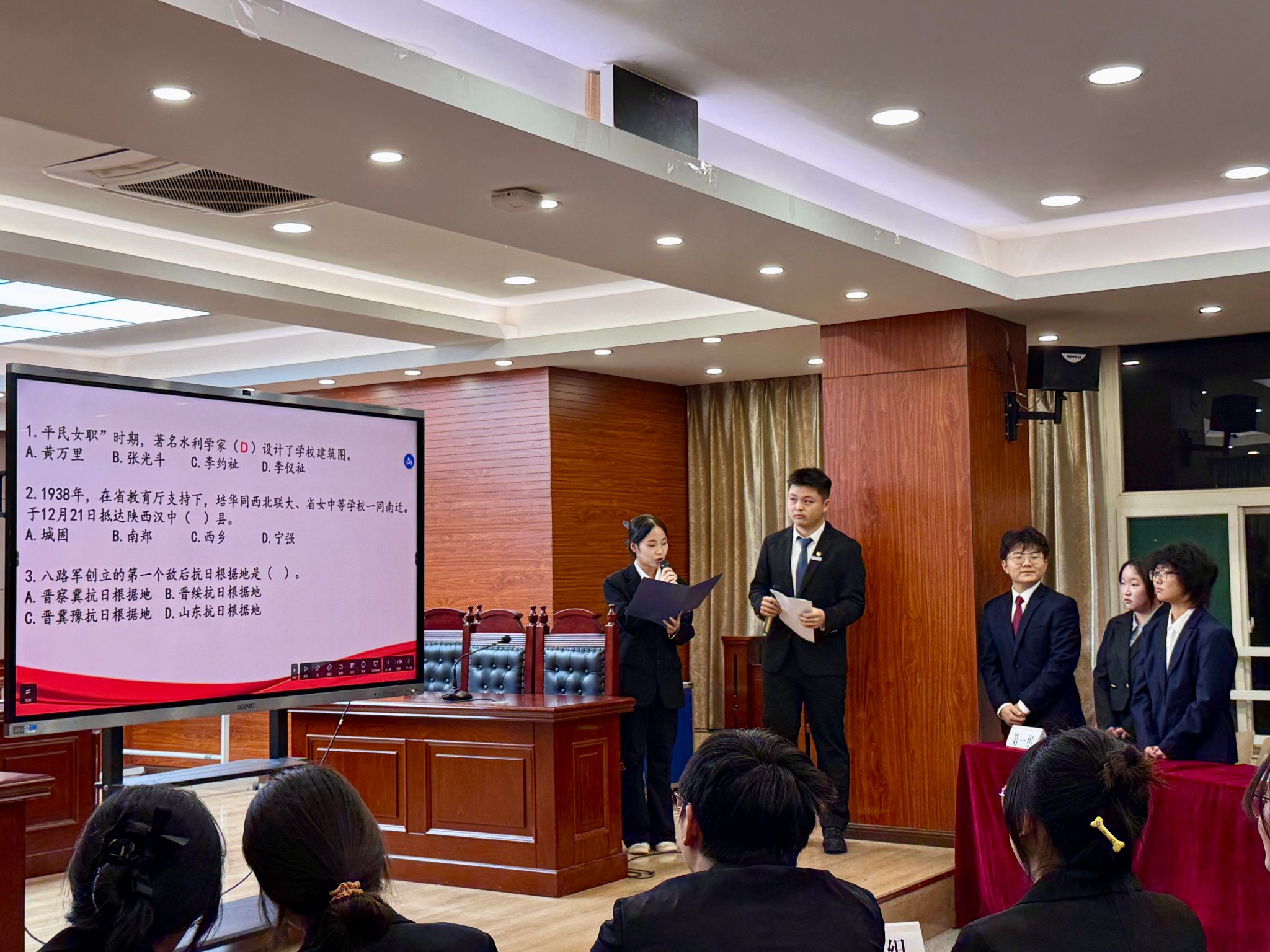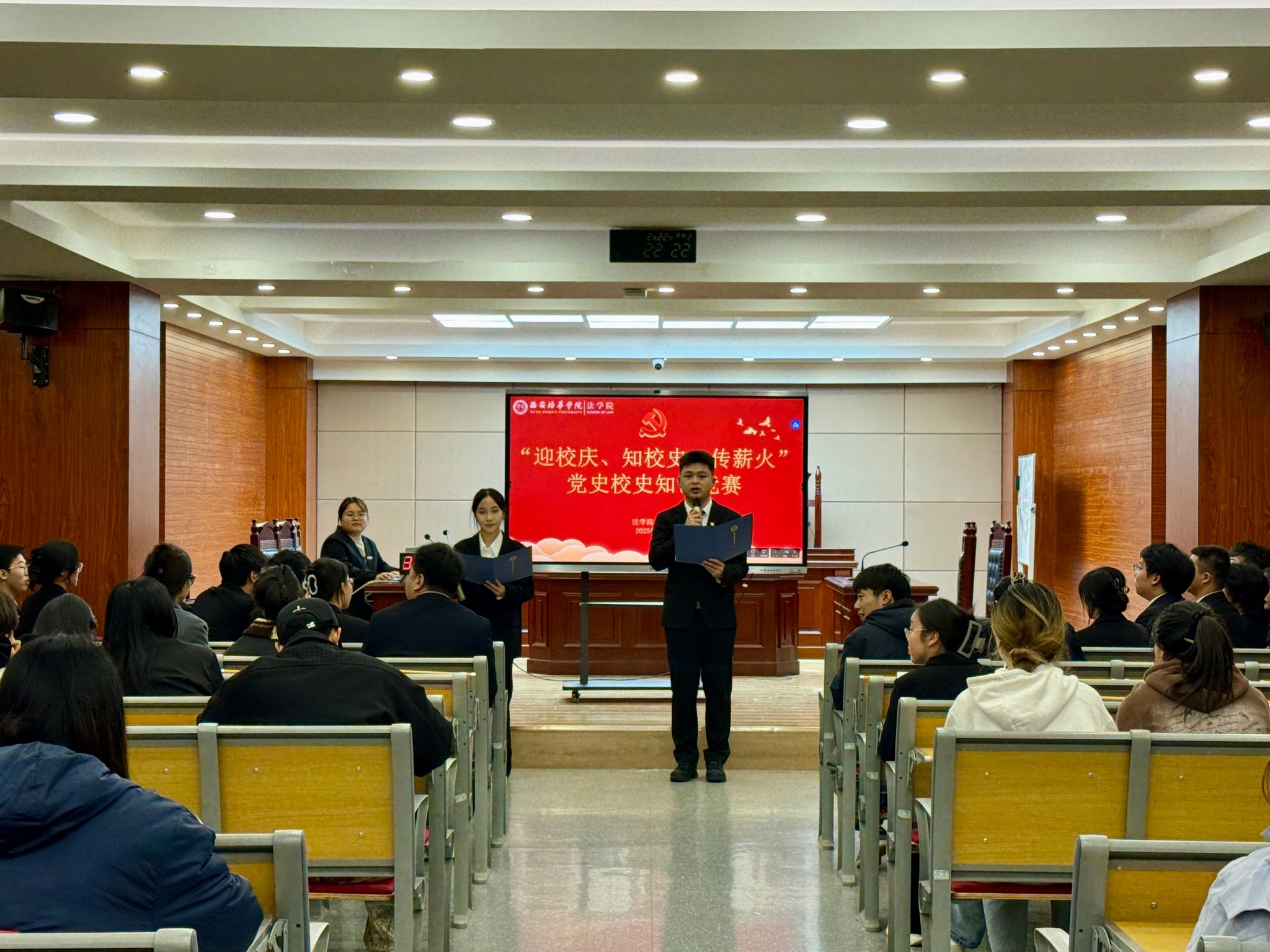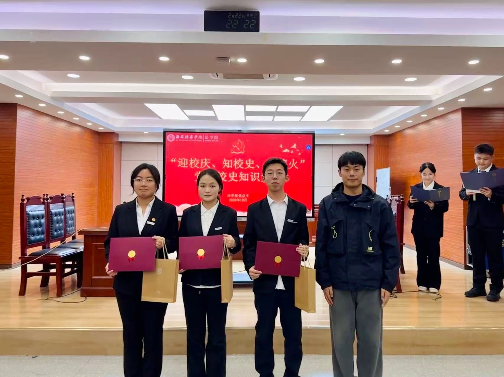 为深入学习贯彻习近平新时代中国特色社会主义思想,推动党史学习教育常态化长效化,弘扬校史文化,传承培华精神,10月22日,法学院党总支在模拟法庭举办“迎校庆、忆校史、铭传承”党史校史知识竞赛决赛。