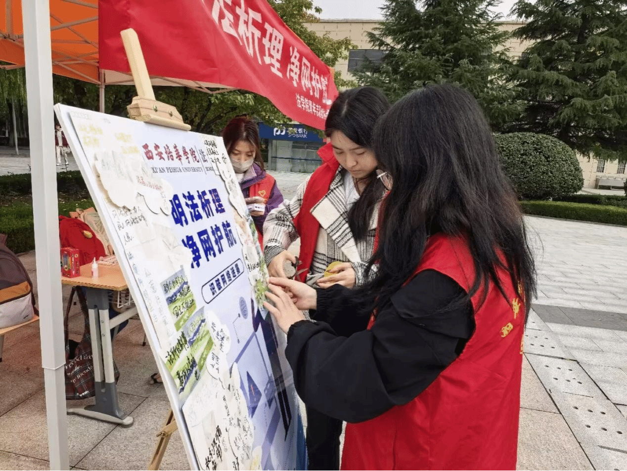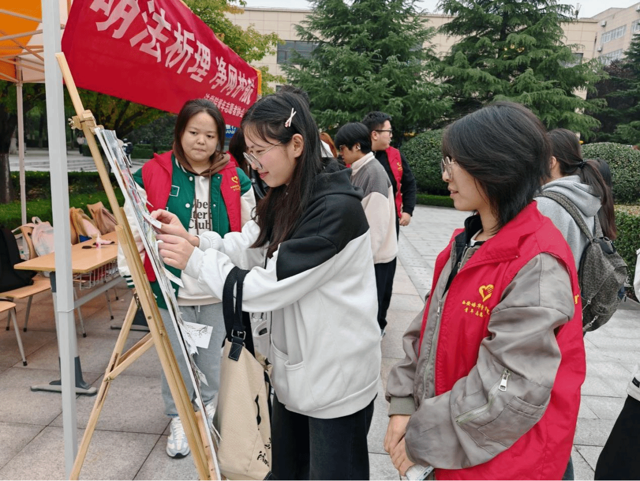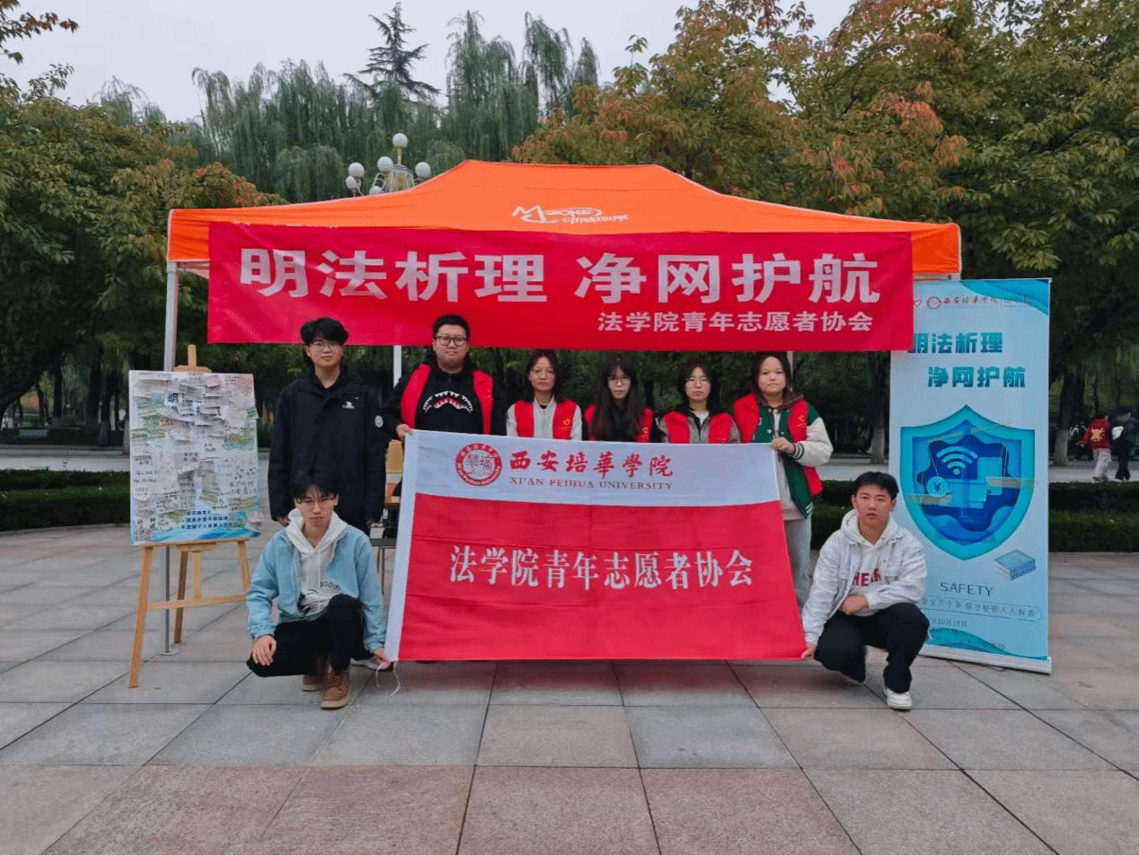为升入贯彻落实党的二十大和二十届四中全会的精神,践行习近平总书记关于青年工作的重要思想,落实《“十四五”国家信息化规划》。西安培华学院法学院青年志愿者协会于2025年10月24日在综合楼西广场举办一场以“明法析理,净网护航”为主题的校内普法活动。