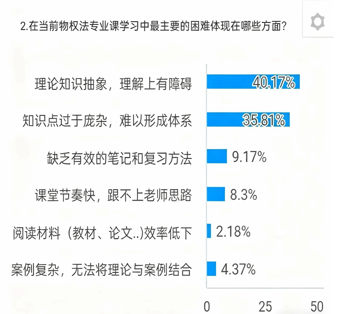 为确保内容贴近实际、有的放矢,在活动筹备阶段,活动前我们专门调研了2024级同学在《物权法》这门课程学习中的真实困难。课前调研发现,多数同学在《物权法》这门课程学习中面临三大难题:物权变动规则理解困难、担保物权与用益物权体系混淆、理论知识难以衔接实际案例。超半数学生仍依赖考前突击的学习方式,迫切希望获得体系梳理方法和案例解析技巧,这为本次小课堂的内容设计指明了方向。
