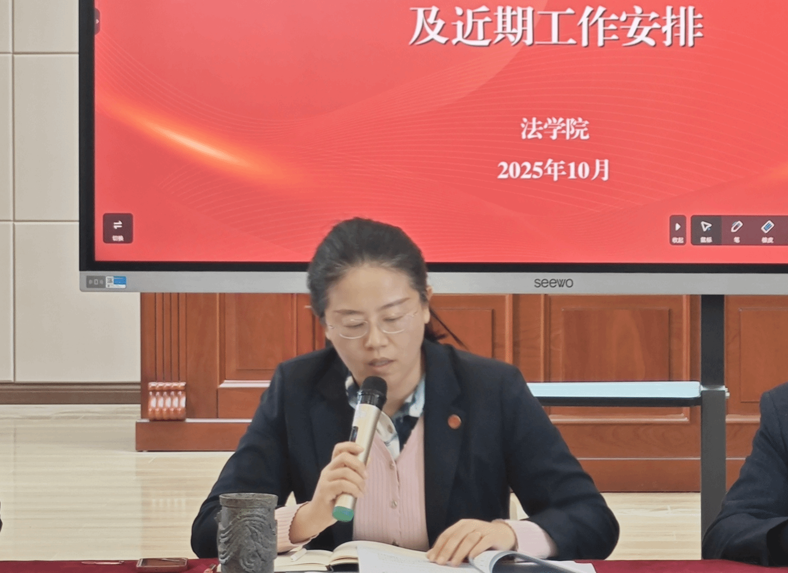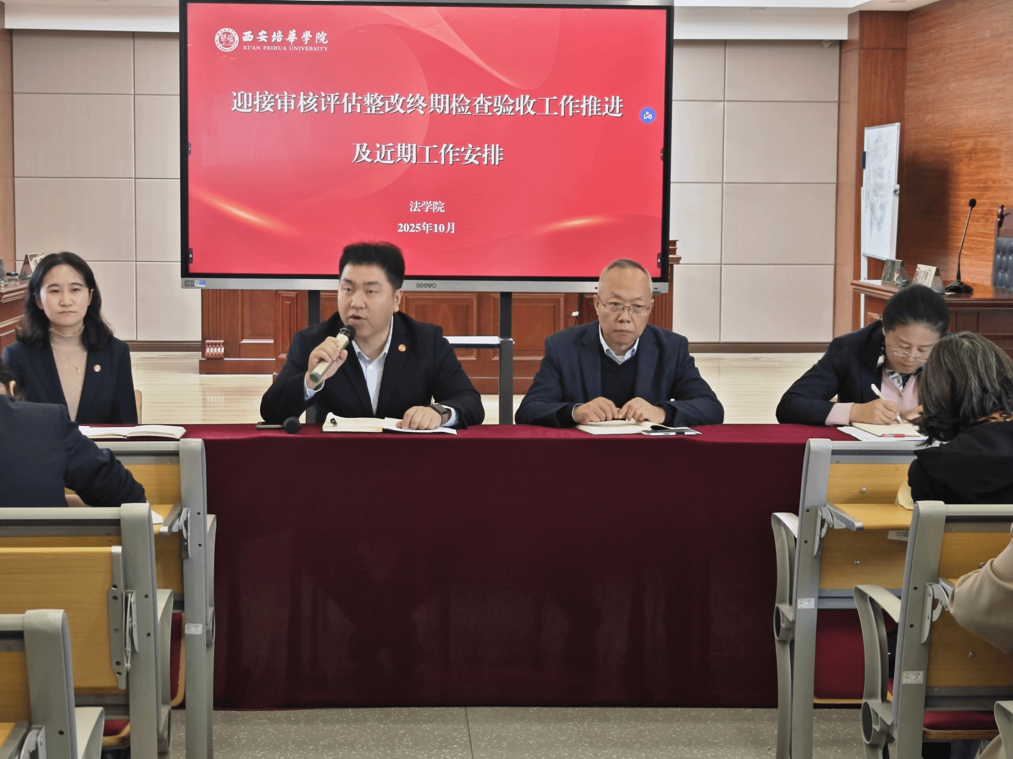 2025年10月31日在模拟法庭法学院召开迎接教育部本科教育教学审核评估整改验收推进会,统一思想,明确目标,为决胜评估验收凝聚强合力。会议由学院党总支书记兼行政副院长韩斌主持。