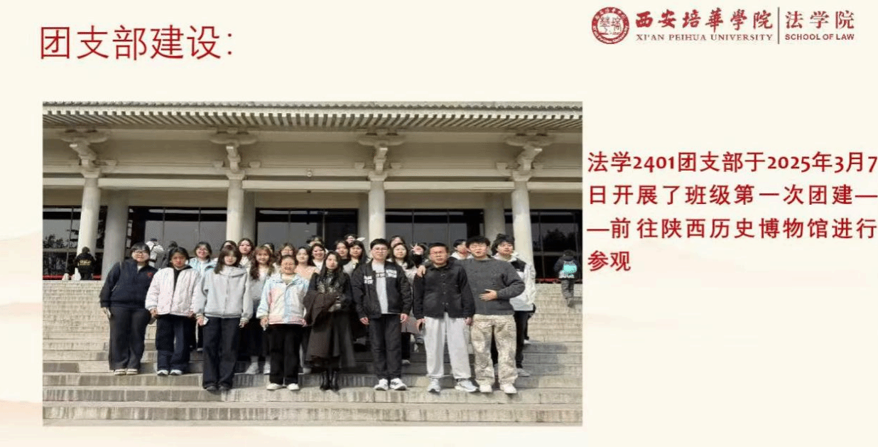 法学2401团支部还会定期开展主题团日活动,形式丰富多样,如在各个节日定期召开专题活动讲座,如博物馆观看学习,丰富知识储备。到红色革命地参观,在泛黄的史料和斑驳的实物前,理解“初心”二字的重量。