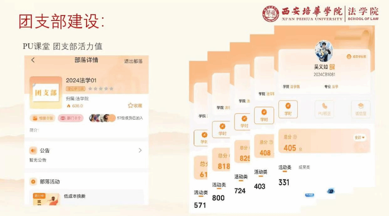 在第二课堂活动开展方面,法学2401班也取得了显著的成果,开展了许多丰富多彩的活动,目前已经申请多达67个部落活动,好评率均达到100%,班级部落的活力值也突破500。三人二课积分高达800多分,近10%的同学二课积分突破400分。支部活力值稳居前端。