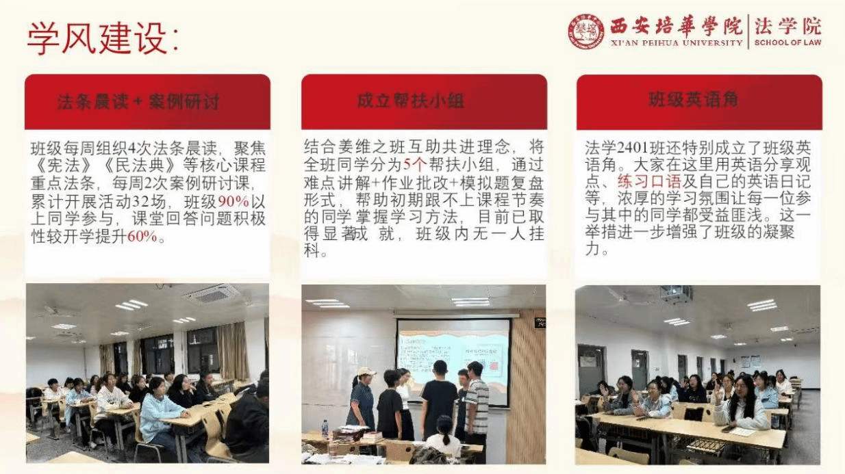 针对法学专业需强化法条记忆与案例分析的需求,组织每周4次“法条晨读”,聚焦《中华人民共和国宪法》《中华人民共和国民法典》等核心课程重点法条,每周2次“案例研讨课”,选取社会热点法律案例,引导同学分组模拟庭审、分析法律适用,累计开展活动32场。