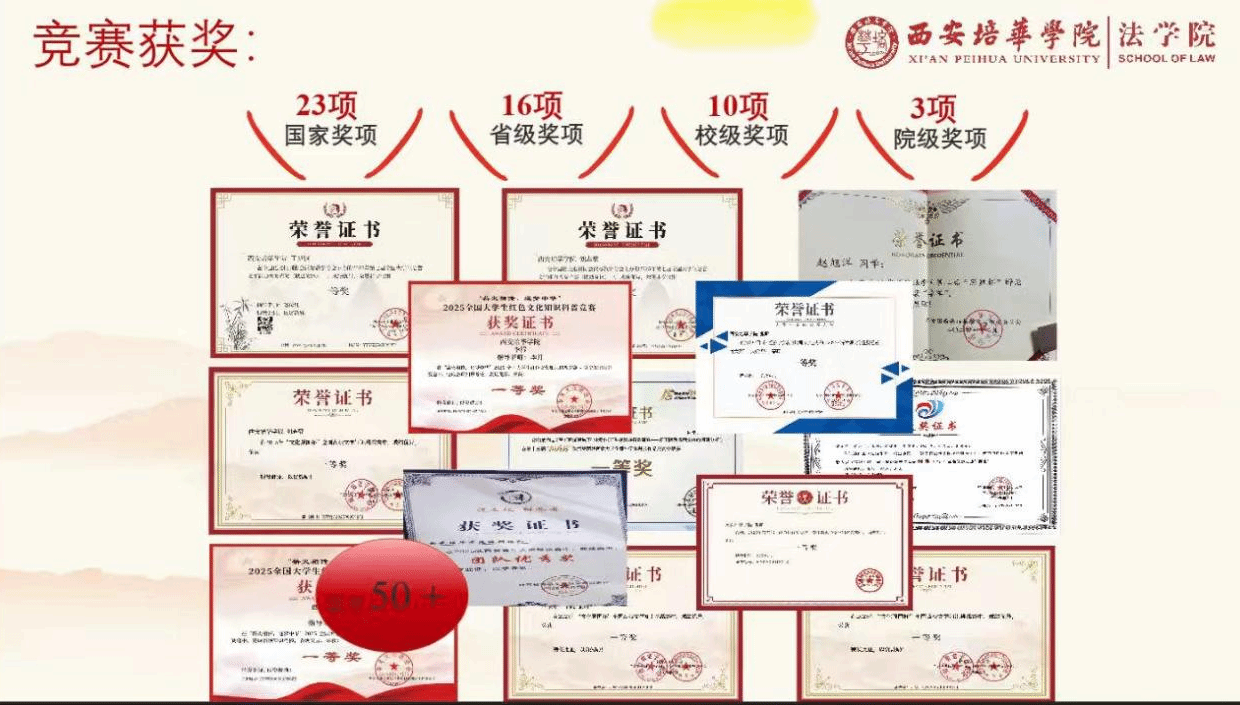 截至目前,法学2401班参加各种比赛竞赛人数18人,占比33%,获省级及以上奖项14人,占总人数25%,所涉比赛包括汉语言文字大赛,各类英语类竞赛,大创比赛等高含金量赛事。