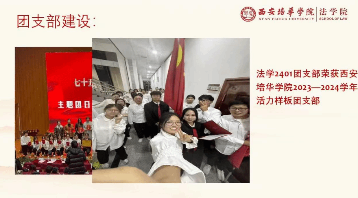 去年法学2401团支部围绕《七十五载家国梦百年培华续新章》开展的主题团日活动展示,融入了现场互动和表演展示等环节。以法学生视角,以朗诵为表演形式,抒发了法学2401班同学对专业的热爱,展现了积极昂扬的精神风貌。在支部投票和现场打分中被评为2024-2025年度活力团支部。以团日活动为契机,激发同学爱国爱校热情,引导同学在个人成长和学校发展的同频共振中续写培华新章,为社会发展贡献更多的培华力量。展示了同学们挺膺担当,踔厉奋发的精神风貌。