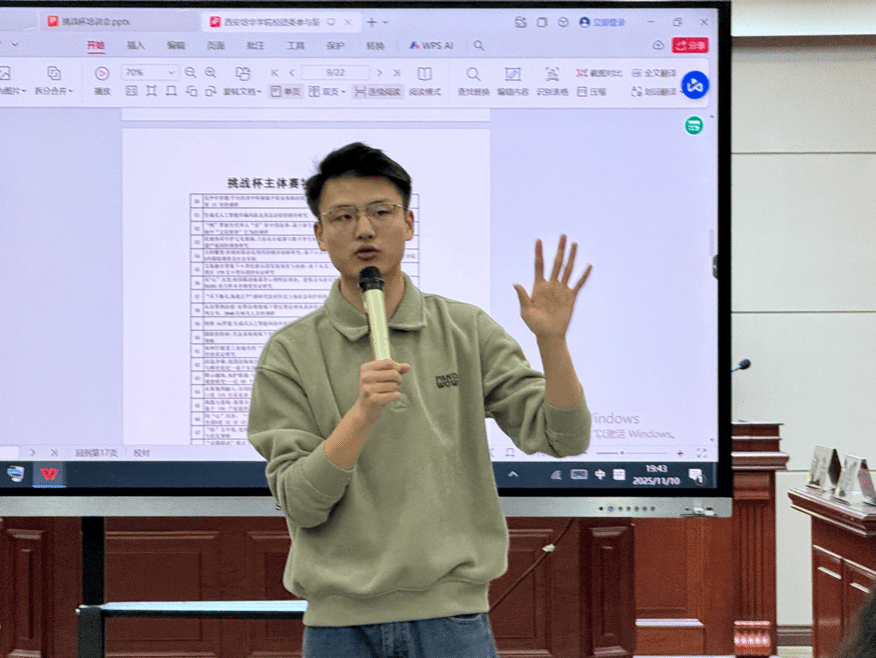 “挑战杯”赛事承载着青年学生的创新热忱,点燃着众人的探索初心。为助力我院学生高效筹备参赛作品,提高学生创作水平,法学院团委邀请到了西安培华学院团委宣传部部长、挑战杯青创营负责人陈天航老师,于2025年11月10日18:30在格物楼1609B举办法学院2025-2026学年“挑战杯”赛前指导答疑会。出席本次活动的有法学院团委书记董可怡、全体团学干部、以及各参赛团队成员。