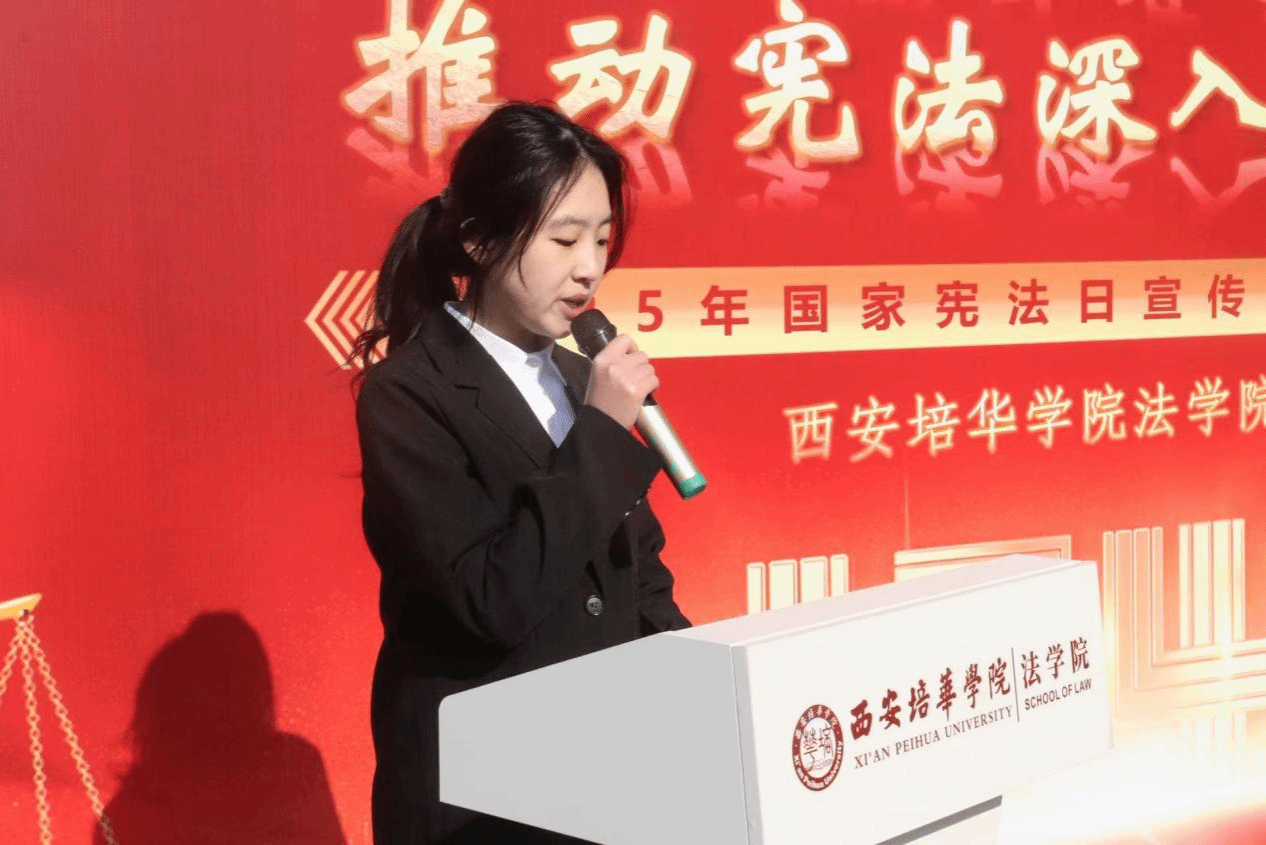 学生代表李思宇从“学宪法”与“讲宪法”的双重角度进行宣讲。她结合自身学习体会,讲述了宪法知识与青年法学子成长的紧密联系,并分享了如何将宪法精神融入日常学习和生活,积极向社会传播法治正能量的思考,展现了法学院学子知法、懂法、守法的自觉与担当。