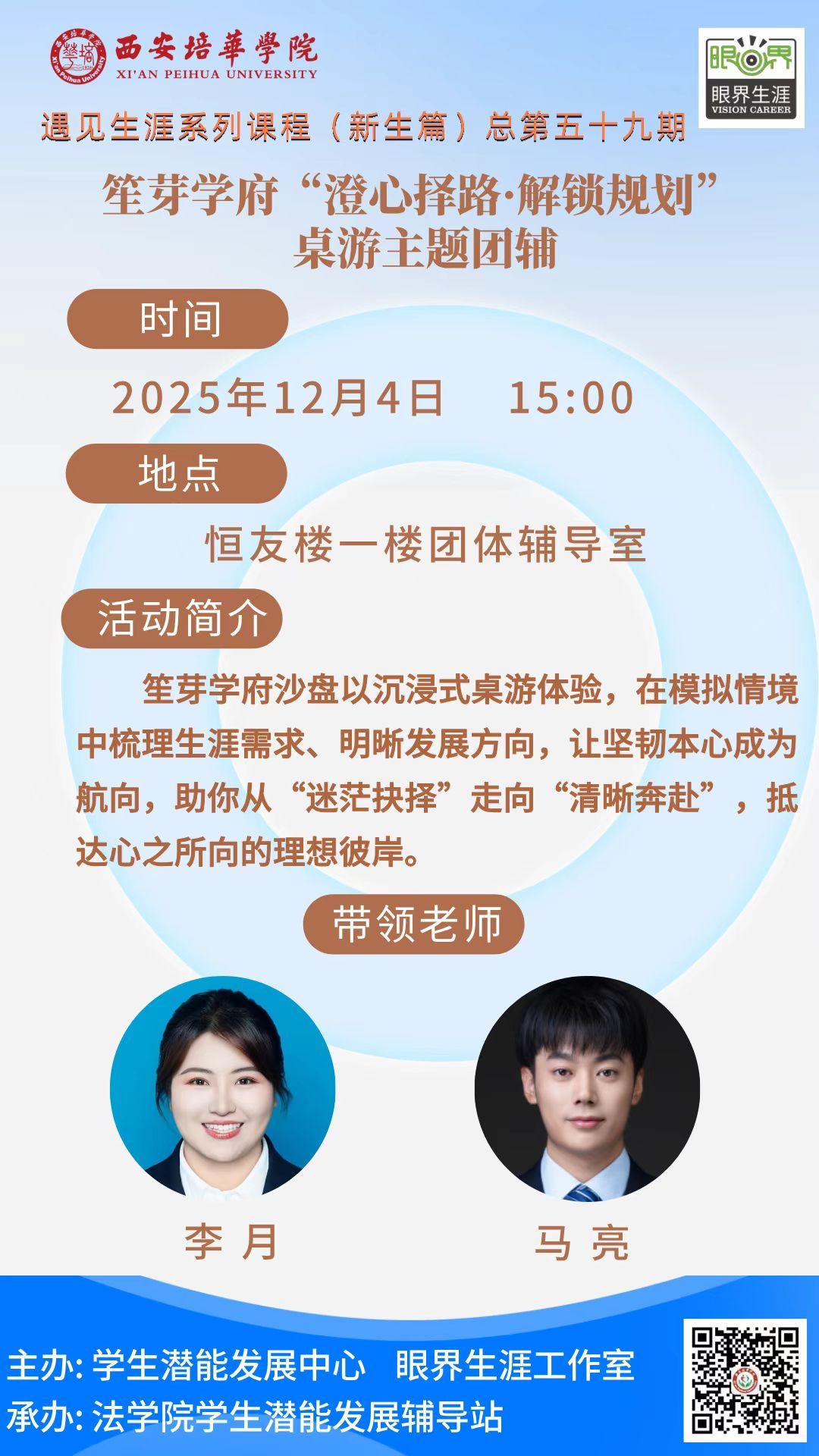 为帮助大二年级法学专业学生破解职业发展迷茫、明晰专业成长路径,近日,学生潜能发展中心联合法学院学生潜能发展辅导站在恒友楼团体辅导室举办“澄心择路·解锁规划”生涯探索桌游主题团体辅导活动。活动由法学院辅导员李月老师、马亮老师组织开展,2024级法学专业学生代表积极参与,以沉浸式模拟体验为大二学子搭建生涯规划实践平台。
