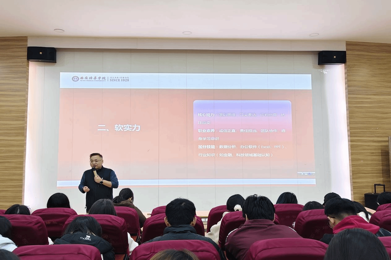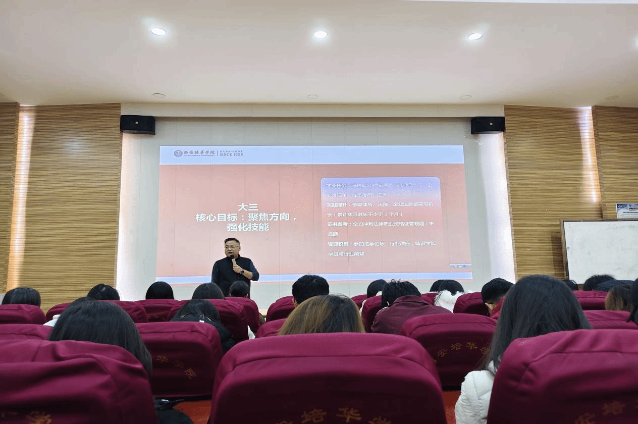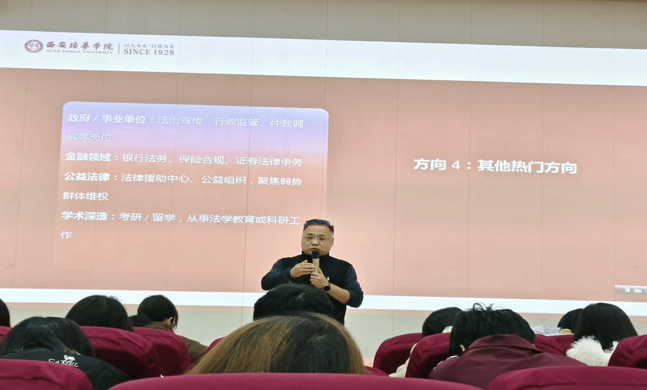 为帮助法学专业学子精准把握就业形势、明晰职业发展方向,缓解就业焦虑,12月4日19:00-21:00,法学院于J102教室特邀陕西君营人力资源集团有限公司高级合伙人石磊开展就业指导专题讲座。讲座围绕就业环境分析、自我认知、心态调整及职业规划四大核心板块,为在场学子带来了一场实用性与前瞻性的就业“干货”分享。