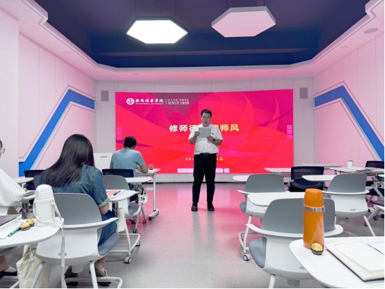 法学院副院长赵洁带领教师们深入学习教育部印发的《新时代高校教师职业行为十项准则》,深入探讨每个准则背后的理念和原则。新时代对广大教师落实立德树人根本任务提出新的更高要求,大家要进一步增强教师的责任感、使命感、荣誉感,规范职业行为,明确师德底线,努力成为有理想信念、有道德情操、有扎实学识、有仁爱之心的好老师。