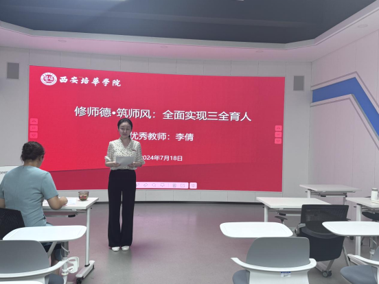 公法教研室主任李倩老师围绕“全面实现三全育人”为大家带来了分享。她提到,师德师风的建设,是在教育领域坚持党的领导,全面贯彻党的方针的具体体现,与中国特色社会主义事业的建设息息相关。新时代的教师需要具有坚定的理想信念、优秀的思想品行、精湛的专业能力。