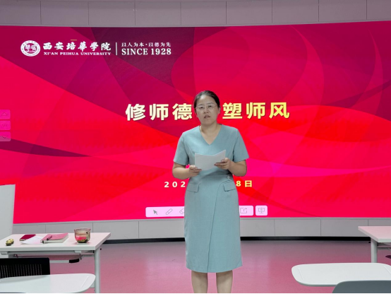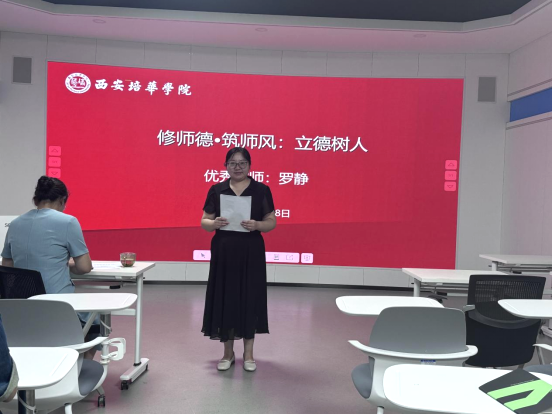 理论法教研室主任罗静老师围绕“立德树人”给教师们带来了分享。她提到,教师的道德风范,对学生的成长起着至关重要的作用。因此,教师在履行自己的责任的同时,必须不断加强自身素质和知识修养,做到了以身立教,才能以自己人格的魅力感染学生学会做人,以自己渊博的学识去引导学生发展。