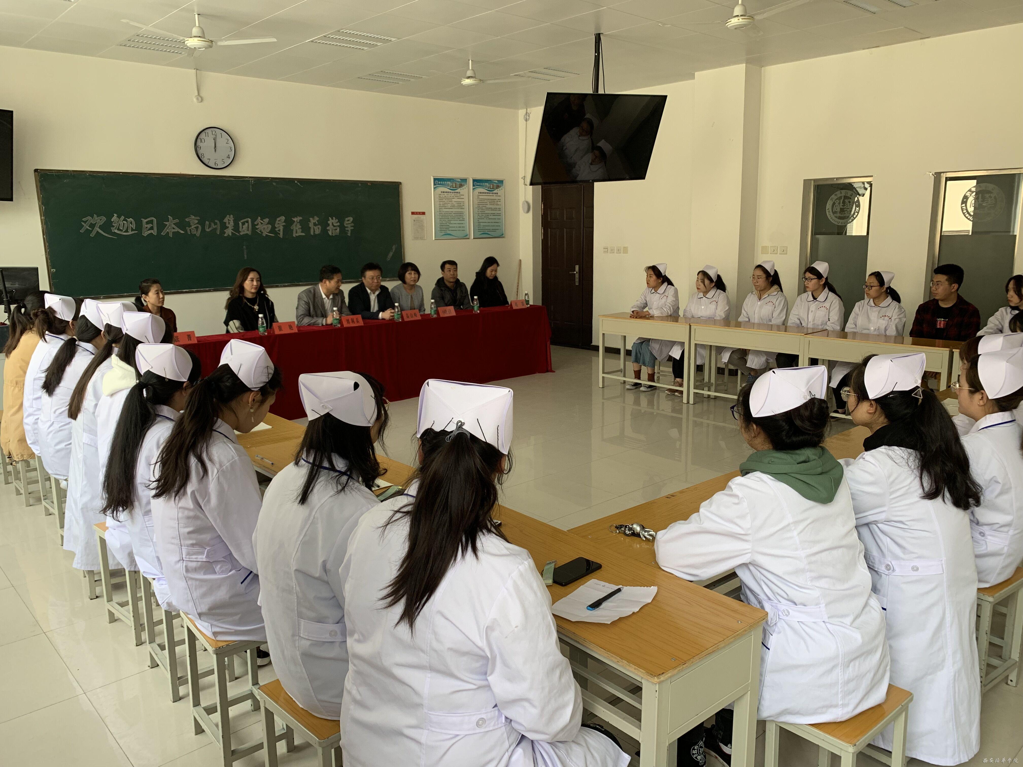 21日下午,日本高山集团理事长高山峰、日本亚细亚学友会(高山教育集团附属语言学校)校长小木曾玉美、陕西瑞邦人力资源管理有限公司总经理黄海滨、陕西瑞邦人力资源管理有限公司培训学校伊博教育校长赵露一行到访我校,看望医学院老师及学生,与医学院2018级中日国际护理班的同学进行了友好交流。我校医学院院长刘利兵、医学院化前珍、刘芳娥、崔艳教授等护理专业负责人接待来宾,并出席了交流会。