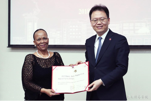为促进更深层次的交流与合作,座谈结束后姜波理事长为斯劳兹·左德瓦·莫哈米主席颁发了西安培华学院荣誉教授的证书,并将中国四大名玉之一蓝田玉作为东道主的礼物送给金砖国家工商理事会南非代表团,再次对主席一行人的到来表示了的欢迎。
