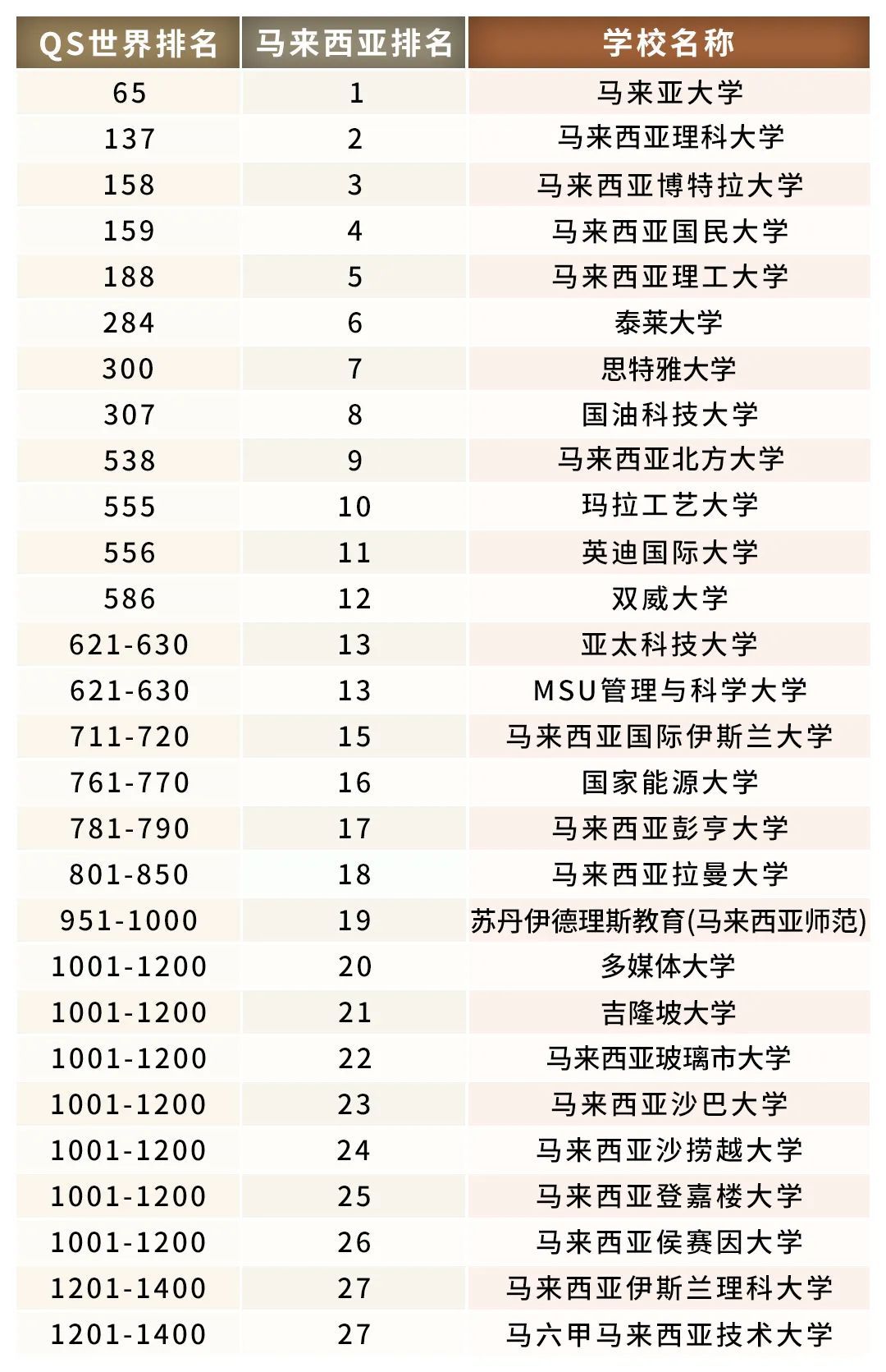 中国高校与马来西亚大学2024年QS世界排名对比
