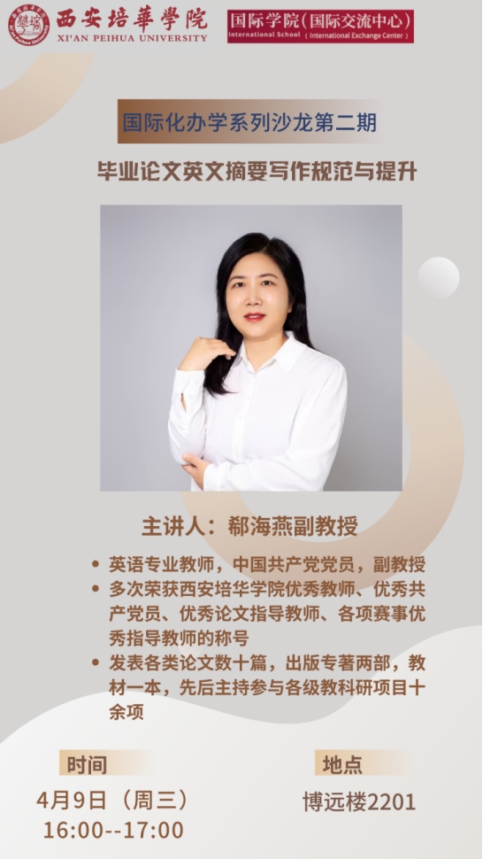 4月9日,西安培华学院国际交流中心成功举办了第二期国际化办学系列沙龙。本次沙龙聚焦“毕业论文英文摘要写作规范与提升的目的”,由人文与国际教育学院外语系的郗海燕教授担任主讲嘉宾,国际交流中心国际化主管侯雪晨主持。来自各个二级学院的30位教师汇聚一堂,共同深入学习英文摘要写作规范,为后续更专业、精准地指导学生产出高质量英文摘要,进而提升学生毕业论文的整体水平奠定基础。