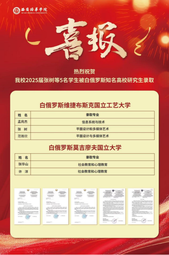 在追求卓越学术的道路上,西安培华学院学子又传喜讯!我校五名优秀学子凭借自身的不懈努力和扎实学识,成功远赴白俄罗斯攻读硕士学位,开启学术新征程。在此,我们向他们致以最热烈的祝贺!