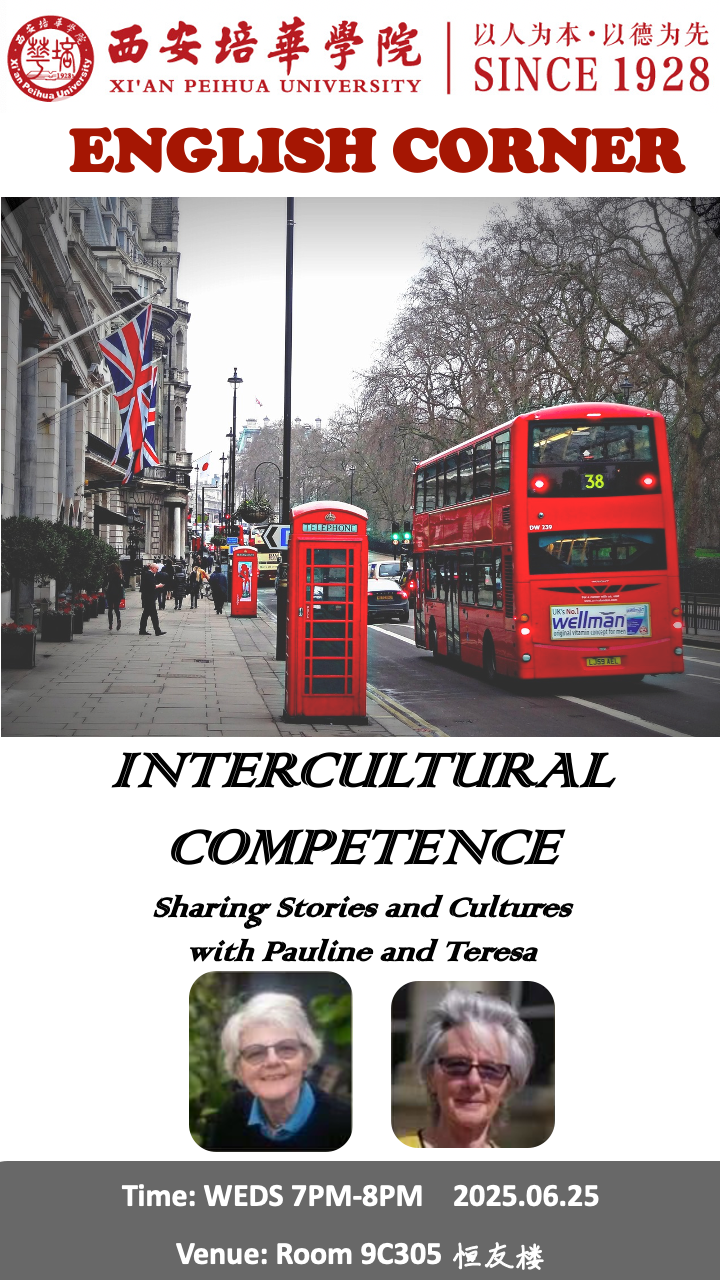 2024-2025第二学期第13次英语角活动将于本周三,6月25日晚上19:00-20:00在恒友楼9C305教室举行。每次英语角会让到场学生签到,学期末会公布各学院学生参与情况,此次活动为本学期最后一次英语角活动,邀请了两位英国女士,银行家和艺术家和学生分享跨文化知识等内容,请同学们积极参加!😉