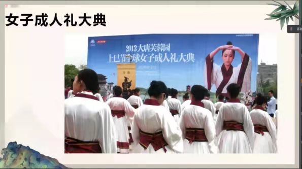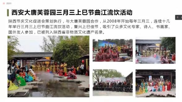 最后,阎教授就如何复兴中国传统节日——上巳节和大家进行了分享。他提出了创新性发展与创造性转化,并结合“西安年·最中国”这一主题,分享了西安这座文化古城是如何继承与发展传统民俗文化的。有服章之美谓之华,有礼仪之大称之夏。在他们的努力之下,西安举办了三月三华服日、大唐芙蓉园三月三上巳节曲江流饮活动以及女子成人大典等丰富多彩的文化活动。不仅有效传承了上巳节文化,更展现了西安古城的文化魅力。