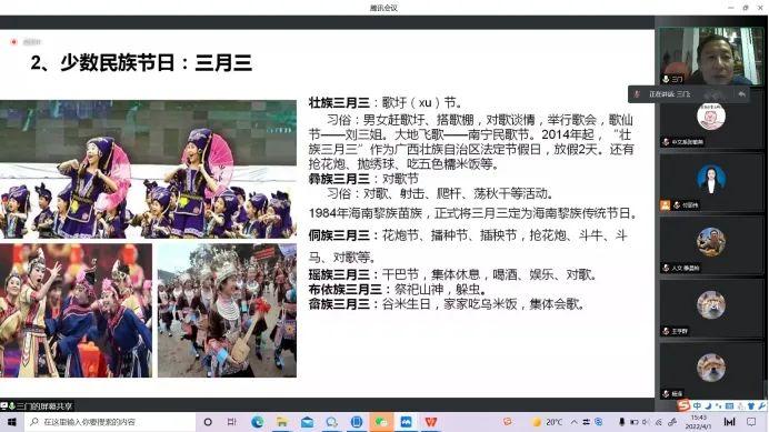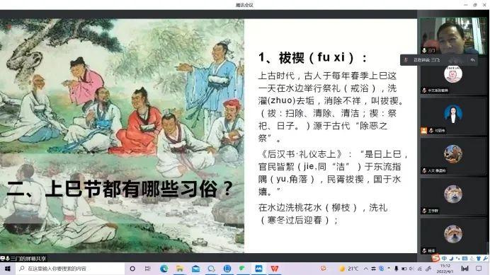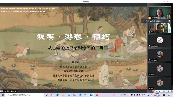 农历三月三日上巳节,是中国最重要的传统节日之一,有着丰富的文化内涵和精神价值,它融汇了中国人对于春天到来的欣喜和求吉辟邪的愿望。为了弘扬民族风俗文化,彰显中文专业的特色,让师生感受、学习和弘扬深厚的中国传统文化。2022年4月1日下午15:00,西安培华学院人文与国际教育学院中文系通过腾讯会议成功举办了“流觞·雅集话上巳”文化活动。本次活动特邀请节庆文化专家阎建滨教授进行《祓禊·游春·相约——从古老的上巳节到今天的三月三》专题讲座。活动由人文与国际教育学院院长助理兼中文系主任付丽伟副教授主持,中文系教师代表以及爱好传统文化的学生代表近300人参加了此次活动。