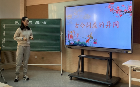 最后,朱君芝老师以“汉语作为第二语言”为主题进行了对外汉语的课堂展示。朱老师在清晰简洁的理论讲解之后,进行了真实的对外汉语课堂模拟,向学生展示如何在课堂中实现“习得”而不单单是“学习”的效果。此外,朱老师还介绍了视频、课堂场地拓展等实现“第二语言习得”效果的教学手段,并精准地总结了实现“习得”的关键要素,即真实、典型、交际。短短一刻钟,却令人受益良多。