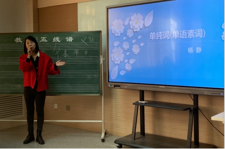 接着,杨静老师以单纯词为主要内容进行了现代汉语课堂示范。杨老师在讲解单纯词中的叠韵词时,巧妙的运用卡片形式,将韵母拆分,通过学生上台互动的方式,带学生温顾音节结构的同时帮助学生更好的理解叠韵中的“韵”为什么不是指韵母整体。此外,杨老师还通过连线题对课堂知识点进行巩固。诸如此类丰富实用的课堂小活动,将原本抽象的现代汉语具象化,提升学生的掌握度。
