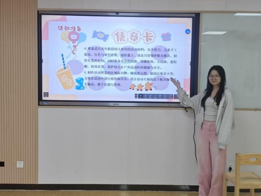 接下来进入试讲环节,学生们以小组为单位,围绕亲子活动依次上台模拟面向家长的活动宣讲与流程演示。中秋小组:以“月满家园·亲子制饼”为主题,试讲中演示引导幼儿做月饼、赏月,同步穿插中秋简化故事,传递节日文化;国庆小组:设计“童心向国·亲子手作展示“小红旗制作”“爱国儿歌合唱”环节,用互动传递爱国情感;元旦小组:打造“亲子共乐,趣享元旦”活动,试讲中明确核心流程——亲子共唱新年拍手歌、共同制作胶囊(幼儿涂鸦目标+家长写寄语)、装饰福娃、亲子大闯关,以及“新年角”延续教育。
