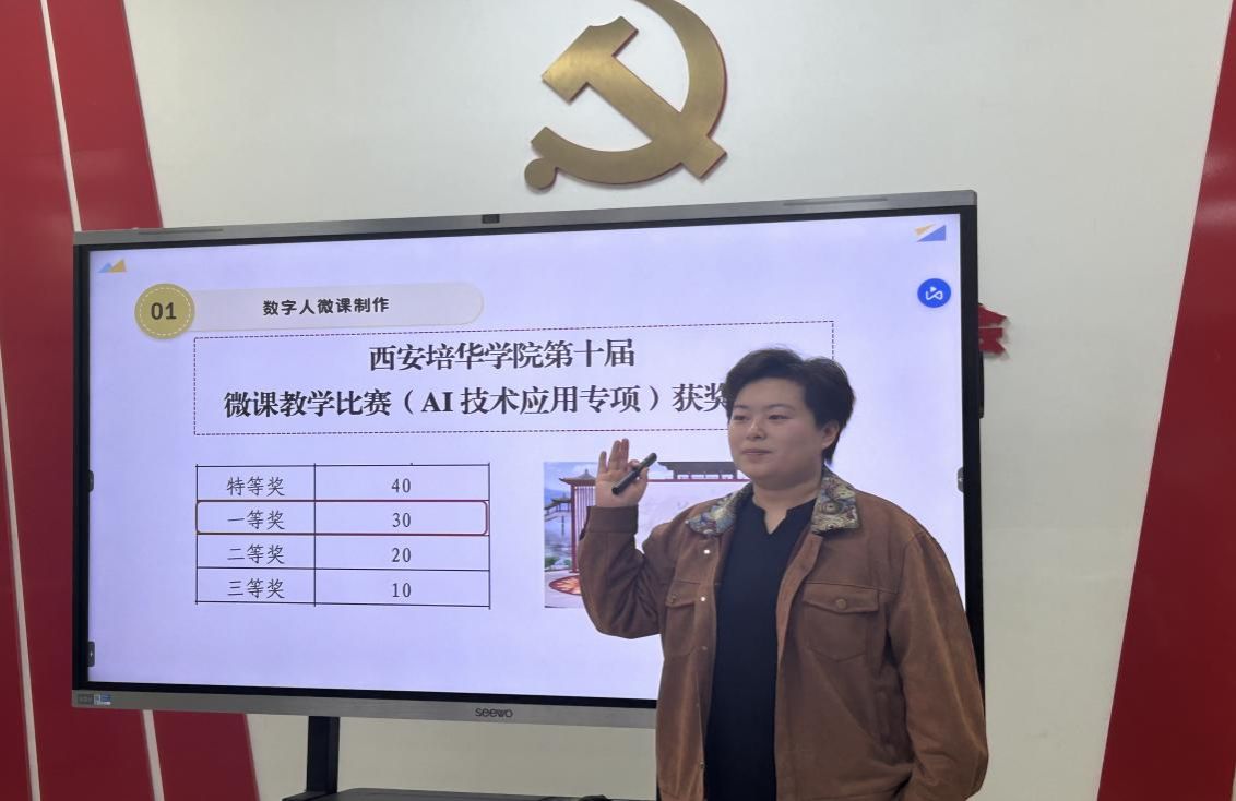 活动中,贾昆诺老师围绕“数字人微课制作”与“AI口语搭子”两大主题展开讲解。她结合西安培华学院微课教学比赛的获奖案例,详细介绍了如何利用“有言”等平台快速生成3D数字人微课,包括素材准备、场景选择、脚本撰写及视频合成等关键步骤。贾老师强调,AI技术不仅能提升教学内容的视觉表现力,还能有效减轻教师制作课件的负担。