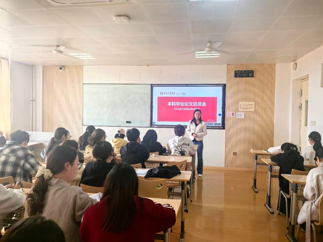 2025年10月15日12:15分,国际语言文化系汉语国际教育专业在1501教室召开了2026届毕业论文动员大会。会议由张莉霞老师主持,汉国教专业五位指导老师和51名应届毕业生参加了本次会议。