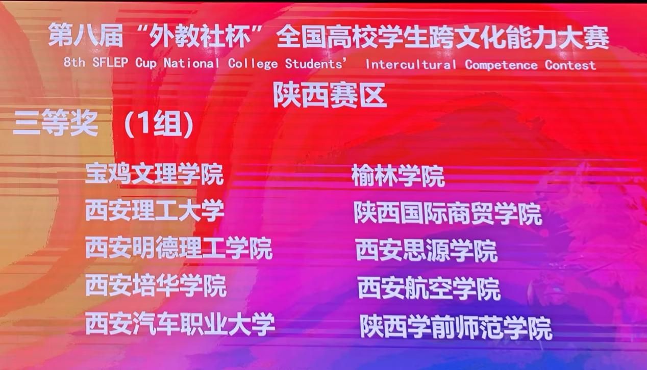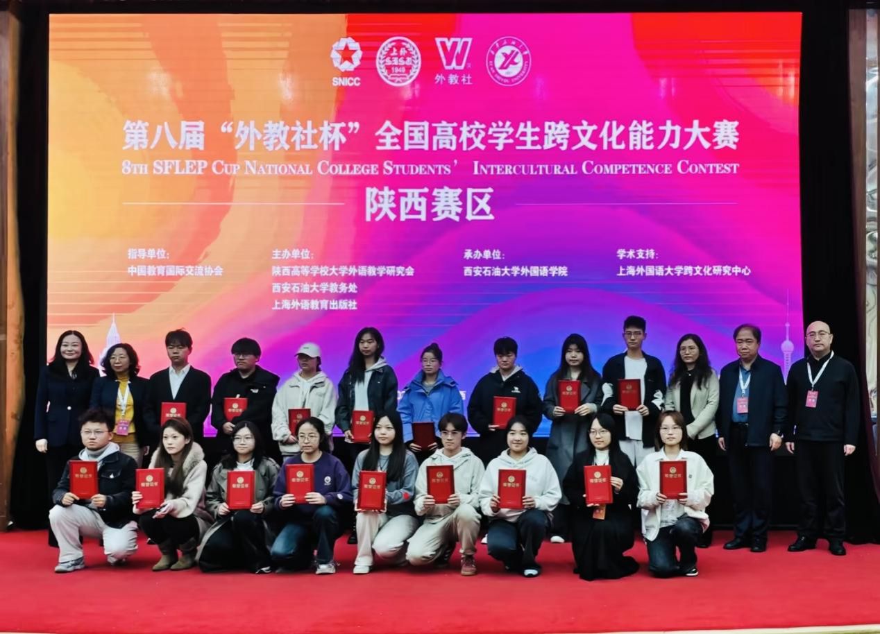 10月18-19日,第八届“外教社杯”全国高校学生跨文化能力大赛陕西赛区复赛在西安石油大学举行。由2024级汉语国际教育专业刘弈含、2022级英语专业张倩茹、2023级法学专业张双三名同学组成的西安培华学院代表队,在国际教育学院梁蕊院长和国际教育学院国际语言文化系沈忱、张欣宜、金培玉三位老师的悉心指导下,凭借出色表现荣获三等奖。
