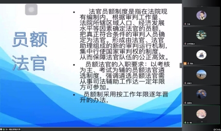 为进一步加强我院法学专业学生对于未来职业的规划意识,了解法学专业的就业前景、就业岗位,让法学专业学生更加清楚社会对于法学专业人才的要求,2022年12月14日晚7点30分至9点,人文与国际教育学院法学系于腾讯会议召开2022-2023年第一学期职业生涯规划与就业指导第一次主题讲座。本次讲座由陕西省西安市新城区人民法院法官助理孙一畅主讲,法学专业21级全体学业导师及学生参加了本次讲座。