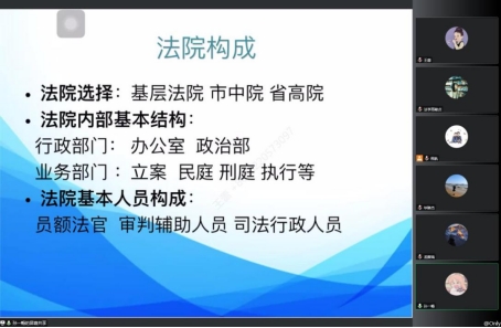 在本次讲座中,孙一畅法官助理重点围绕“法院的主要构成、法院各岗位的职能及要求、如何备考法院”等三个方面展开讲解。首先,孙一畅法官助理介绍了人民法院的内部构成,包括基本结构以及人员构成,让同学们对法院有更深一步的了解,帮助同学们更好的进行职业选择。