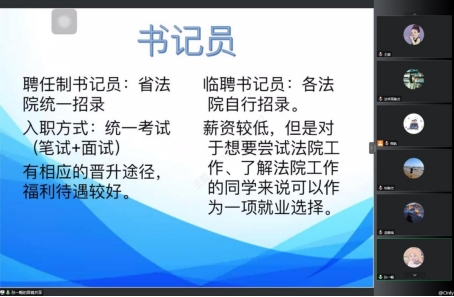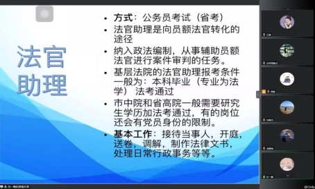 接着,孙一畅法官助理从法院各个岗位的职能与要求入手,详细的介绍了员额法官、法官助理和书记员等法院主要岗位的职责及该岗位应该具有的能力。孙一畅法官助理指出目前法学专业想要入职法院有三种方式,一种是通过省考进入法院担任法官助理,法官助理要求必须要通过司法考试,且法官助理是向员额法官转化的必经之路,参加省考进入法院担任法官助理对同学们的专业要求较高,大家一定要巩固自己的专业知识,通过司法考试,并且尽力的大学期间获得党员的身份。第二种入职法院的方式是参加陕西省人民法院统一招录的书记员考试,这种考试竞争压力相较于省考较小,且福利待遇较好。最后一种方式是通过各法院自行招录担任临聘书记员,这种方式最容易进入,但是薪资待遇有限,对于相入职法院的同学作为一个过渡阶段的工作是一个不错的选择。