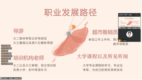 外语系英语专业职业生涯规划与就业指导系列讲座第四场于线上举办。本次研讨会由阿里巴巴国际站客户经理毕国芳主讲。毕女士曾在1688的B2B业务领域工作,在工作中曾多次获得“明日之星”等荣誉称号。毕女士主要为同学们介绍了在电子商务及外贸领域的就业情况,并为同学们如何做好未来就业准备做出了指导。本次讲座由外语系英语专业教师王星月主持,英语专业21级全体学生参加。