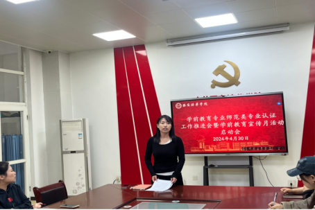 人文与国际教育学院学前教育系于2024年4月30日在第四会议室召开学前教育专业师范类专业认证工作推进暨学前教育宣传月活动启动会。人文与国际教育学院常务副院长梁蕊、教学副院长栾博强出席本次会议,学前教育专业带头人刘迎接、系副主任王斯文以及学前教育专业全体专任教师参加,会议由学前教育系主任王璐露主持。