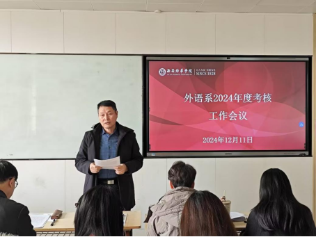 12月11日,外语系在1401教室召开2024年度考核工作会议,深入解读学校本年度绩效考核相关文件。此次会议由外语系主任李国栋主持,英语专业带头人齐仲里、外语系副主任金培玉、曹长春以及大学英语课程负责人贾梦琦,外语系全体教师参加了本次会议。