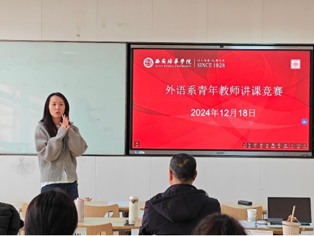 为助力青年教师自身成长,加强青年教师队伍建设,充分发挥教学技能比赛在提高教师队伍素质中的示范引领作用,鼓励教师积极钻研教学业务,创新教学方法和教学手段,推进现代教育技术与传统课堂的深度融合,进一步提升教学能力,提高教育教学质量,人文与国际教育学院外语系12月18日举办了第十四届青年教师教学竞赛。本次竞赛邀请了第12届“外教社杯”全国高校外语教学大赛陕西赛区英语专业组一等奖获得者、西安理工大学外国语学院李琳桢老师担任校外评委,外语系英语专业带头人、校级督导齐仲里教授,外语系副主任金培玉老师、大学英语课程负责人贾梦琦副教授、外语系周萍老师担任校内评委,外语系部分教师观摩了比赛。