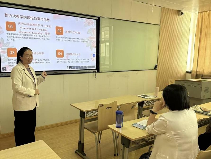 活动中,陈祖君老师结合当前专业英语教学中语言与专业脱节、教材单一、评估局限等问题,提出将外国文学课程与专业英语深度融合的创新思路。她通过案例分析,展示了如何通过内容与语言融合学习(CLIL)理论、建构主义教学观等,设计“注入式-课题式-任务式-专题式”四阶教学框架,并以天津外国语大学的实践为例,介绍了跨学科模块开发、双导师制项目、数字化资源建设等具体举措。