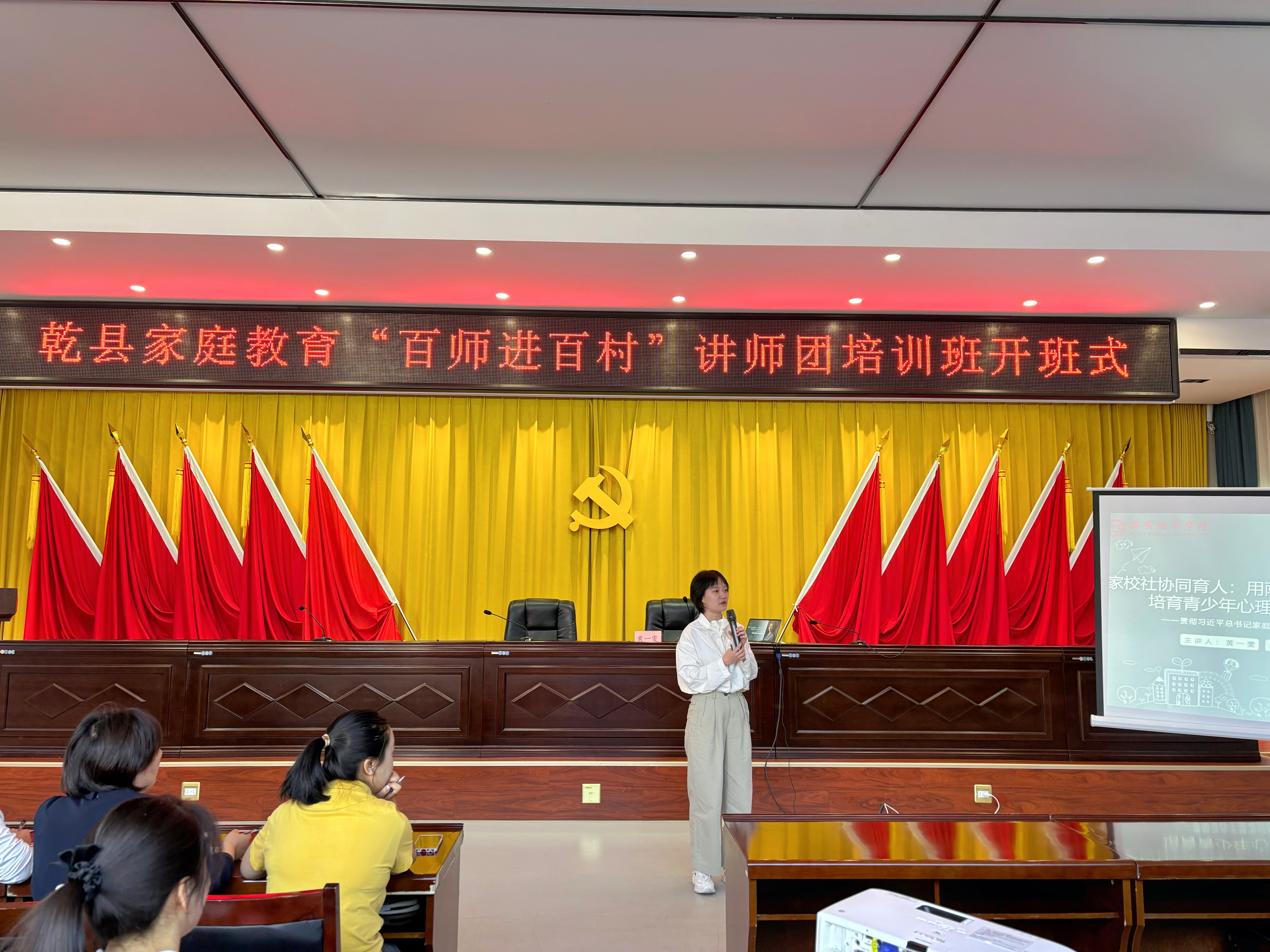 上午9时,培训活动在庄严的国歌声中拉开帷幕。乾县妇联主席刘茜在致辞中指出,家庭教育是国民教育体系的重要组成部分,乾县近年来通过“爱心妈妈”志愿服务、“点亮微心愿”关爱行动等举措,持续深化家庭文明建设。她强调,本次“百师进百村”活动旨在打造一支专业化家庭教育师资队伍,通过“送教下乡”“驻点指导”等形式,将科学教育理念送到千家万户,切实提升基层家庭教育水平。