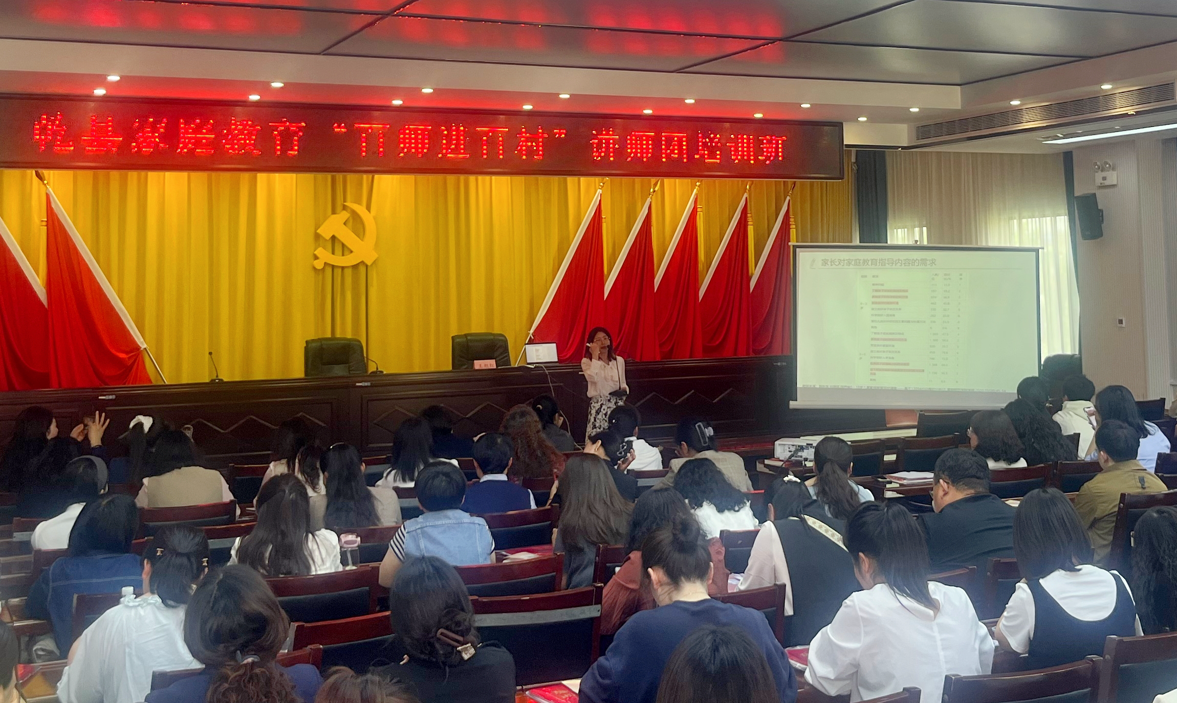 为深入贯彻习近平总书记关于家庭家教家风建设的重要指示精神,推动家校社协同育人体系建设,2025年4月23日,由乾县教育局、乾县妇联、乾县家庭教育指导中心联合主办的家庭教育“百师进百村”师资培训活动在乾县新时代文明实践中心举行。来自全县中小学各级各类学校的校长、教育专家,以及公检法机关的各级领导等120余名代表参与本次活动,共同探索新时代家庭教育创新路径。西安培华学院作为受邀单位,特别选派人文与国际教育学院学前教育系骨干教师黄一雯、王旭红担任主讲专家。两位教师立足"家校社协同育人"理念,通过理论讲解、案例分析、情景模拟等多元化形式,系统解析了《家庭教育促进法》的实践应用策略,分享了青少年心理健康教育的前沿研究成果,为参训人员提供了可操作性的指导方案。