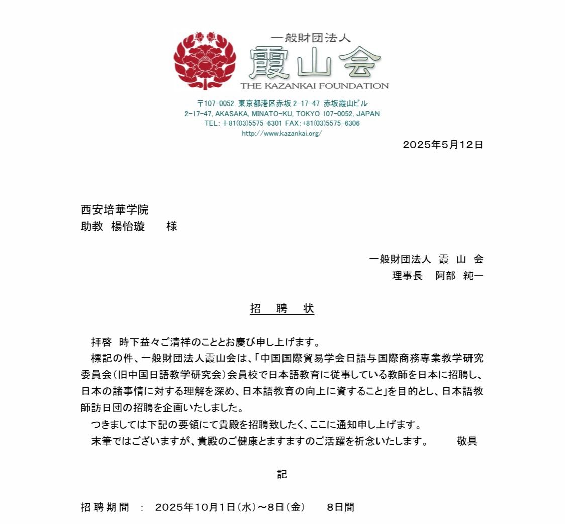 为促进中日两国教育文化领域的深度交流与合作,进一步提升我国高校日语学科建设水平,中国国际贸易学会日语与国际商务专业教学研究委员会(原中国日语教学研究会)与日本一般财团法人霞山会达成共识,将共同组织中国高校日语专业青年教师赴日交流项目。经严格遴选,最终从全国高校中选拔出10名优秀青年教师代表,计划于2025年10月1日至8日赴日本进行为期8天的学术交流与考察。