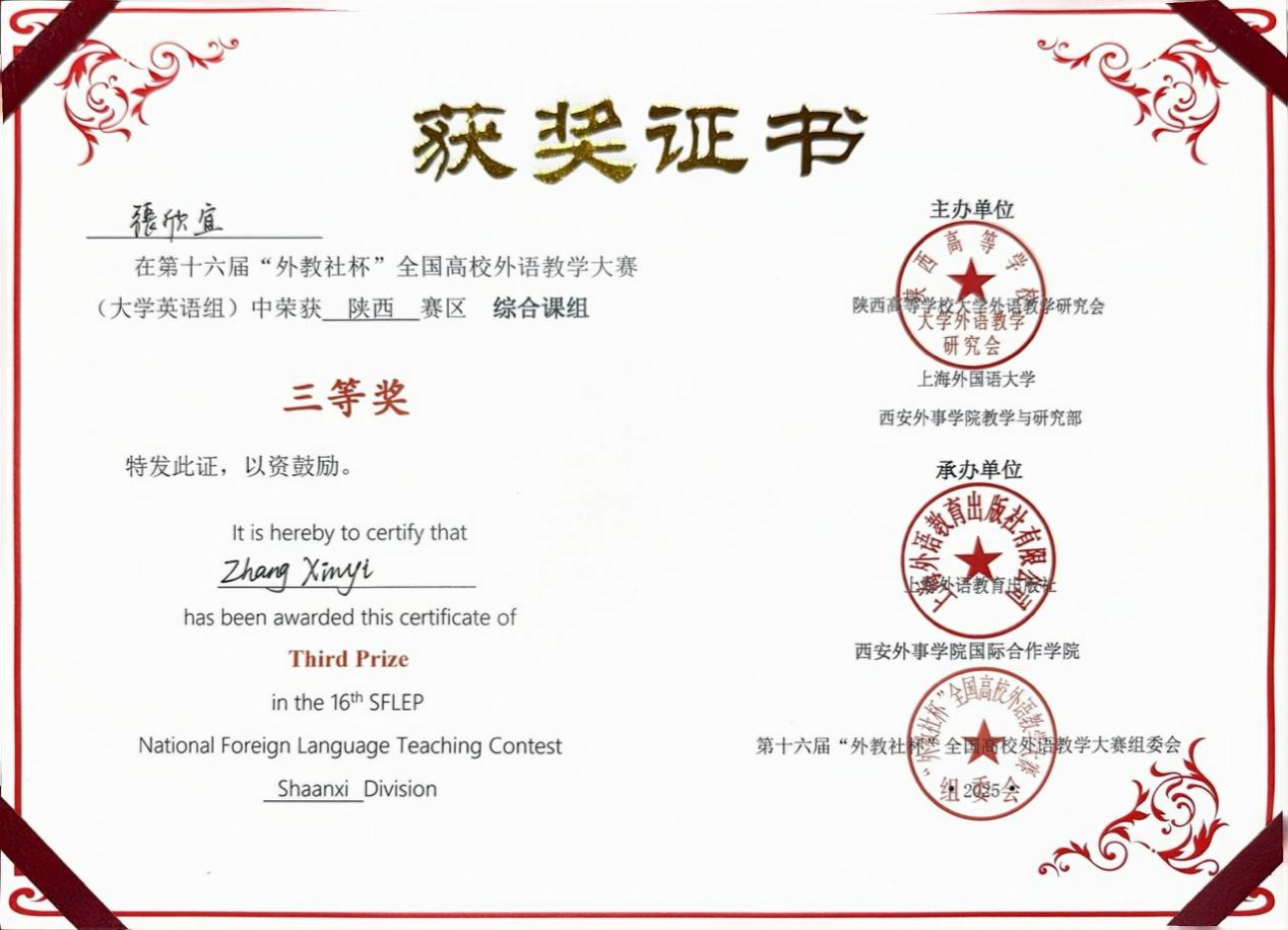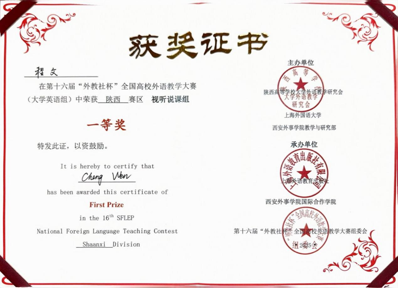 在6月21日-22日举办的第十六届“外教社杯”全国高校外语教学大赛(大学英语组)陕西赛区复赛和决赛中,人文与国际教育学院外语系教师程文和张欣宜代表学校参赛,取得优异成绩,分别获得视听说组一等奖和综合组三等奖。创下该赛事历史新高。