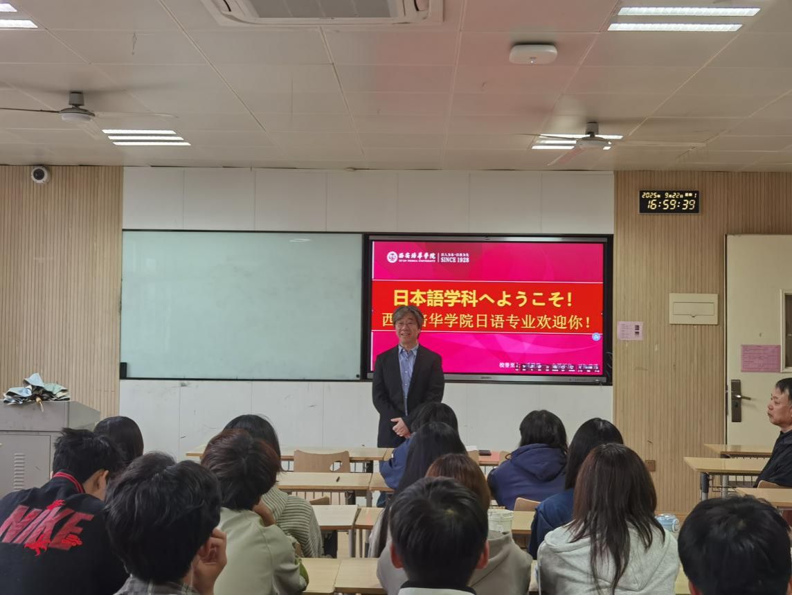 日语专业带头人杨晓钟教授随后分享,语重心长地引导新生正确认识大学的学习与生活,传授“多读多背”这一简单高效的日语学习方法,并寄予“自爱、自尊、自立、自强”的期望。