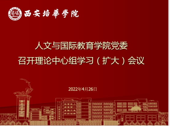 2022年4月26日,西安培华学院人文与国际教育学院党委于格物楼第四会议室召开了党委中心组学习(扩大)会议,共同学习《坚持走中国特色社会主义法治道路 更好推进中国特色社会主义法治体系建设》、《深刻理解和把握总体国家安全观》、《习近平总书记给中国冰雪健儿的回信》等文件精神并结合我院实际开展交流研讨。人文与国际教育学院党委书记、行政副院长王飞主持会议,学院党委委员、学院党务干事及全体党支部书记参加学习。