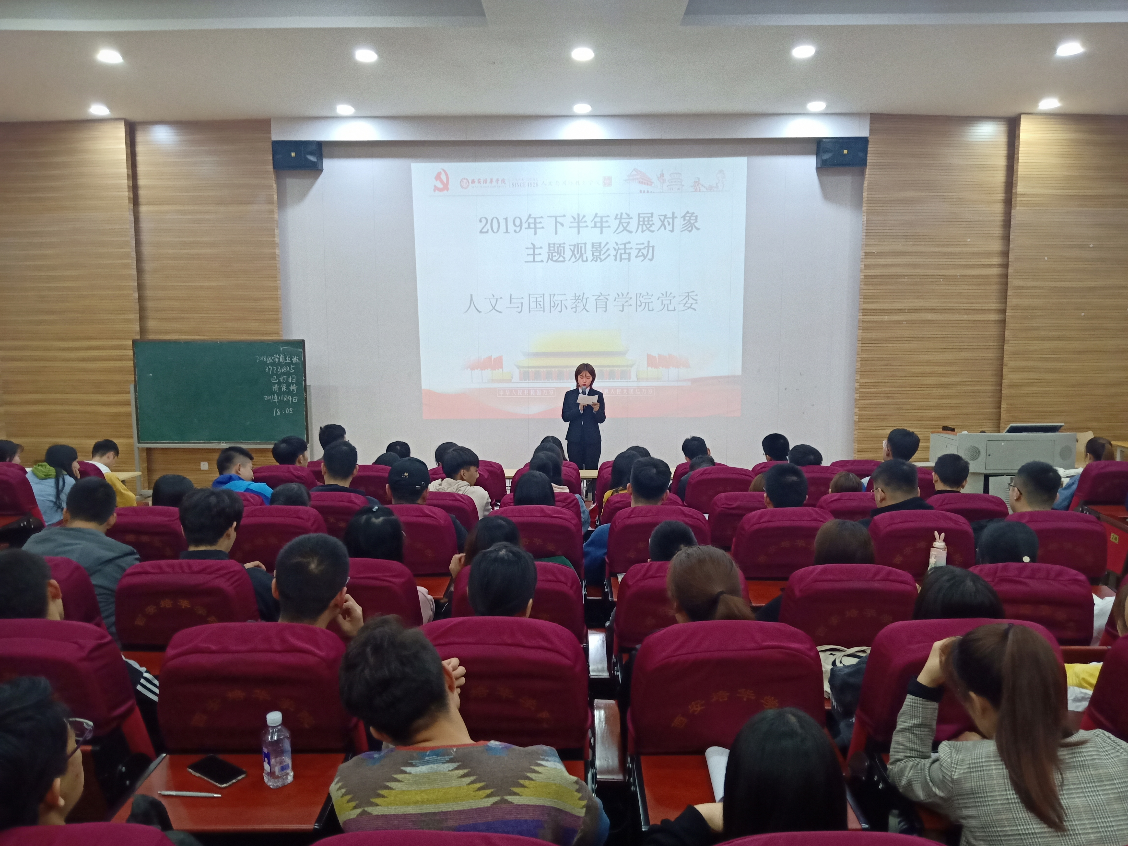 为进一步做好新形势下发展党员工作,确保发展党员质量,按照校党委工作安排,人文与国际教育学院党委于11月4日晚19点组织2019年下半年发展对象于格物楼J101教室集中观影《建党伟业》。本次活动由刘希瑶主持,我院七个学生支部共计124人参加了集中观影活动。